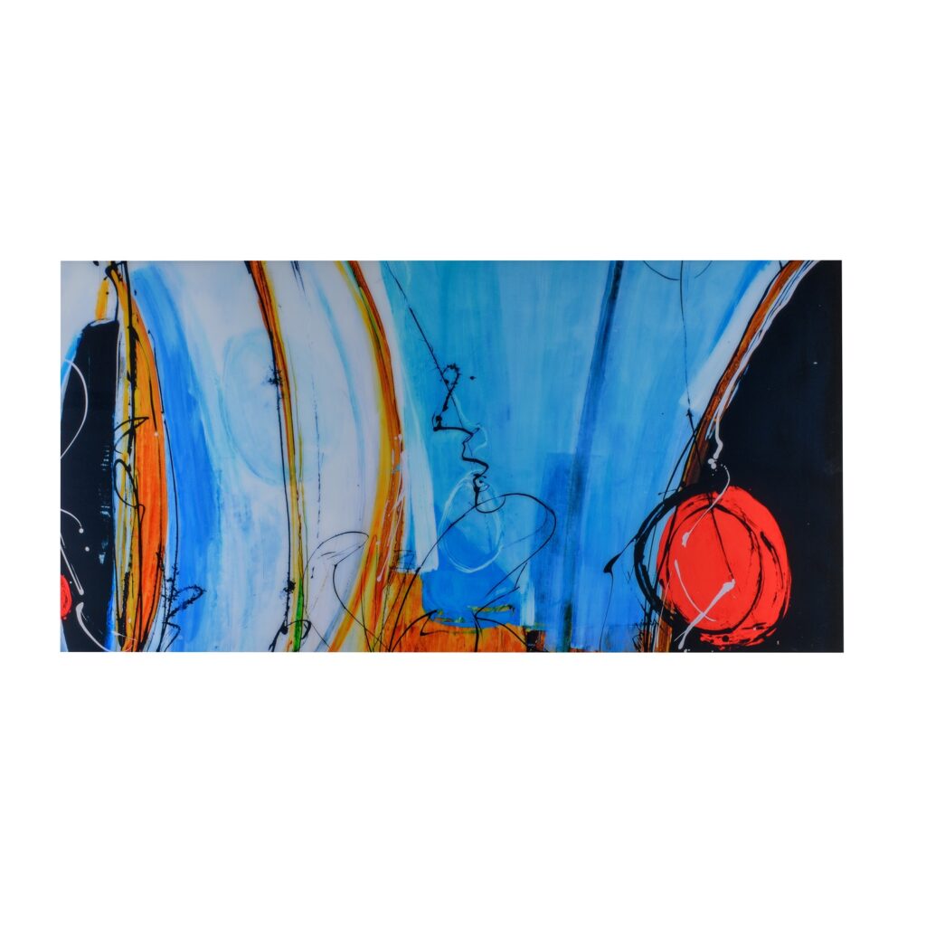 [0] => The Playground Wall Art experiments with bold, rich color and curving, abstract shapes. Vibrant blue, red, orange, and white are rendered across a black background for a work of art that is lively and contemporary. This painting has a gloss finish and bleeding borders.