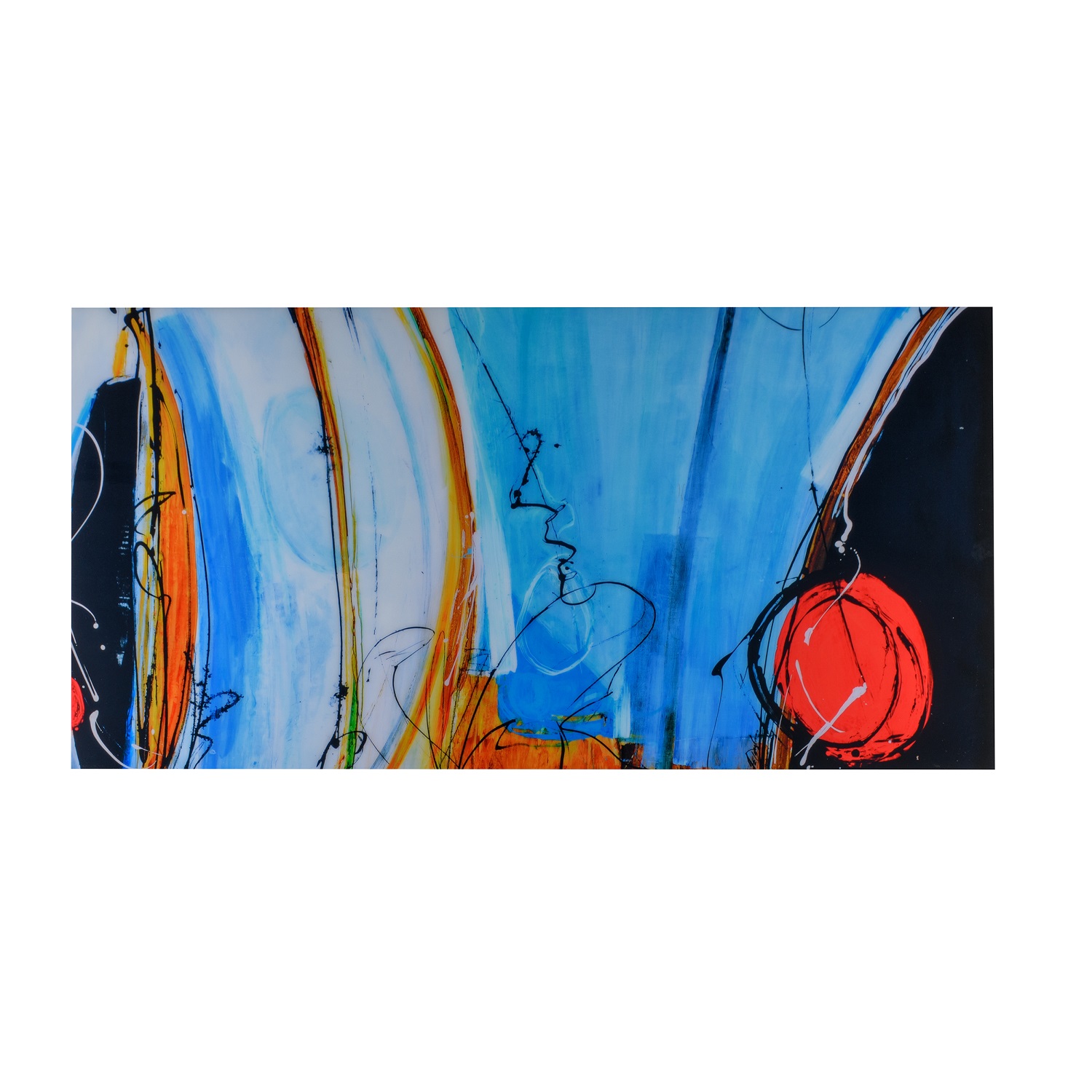The Playground Wall Art experiments with bold, rich color and curving, abstract shapes. Vibrant blue, red, orange, and white are rendered across a black background for a work of art that is lively and contemporary. This painting has a gloss finish and bleeding borders.