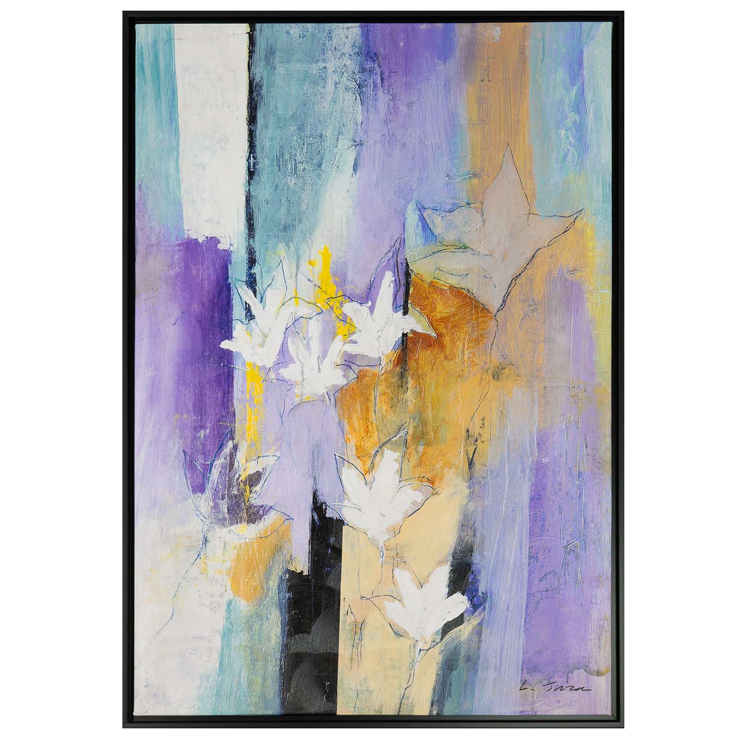 [0] => Poe's Ragtime, by the artist L. Tuza, is a contemporary painting depicting white flowers on an abstract background. The outlined flower shapes in the foreground resemble lilies or daffodils, surrounded by bold stripes of purple, teal, orange, white, and black. Available with a black frame, Poe's Ragtime is a work of art that is both simple and dynamic.