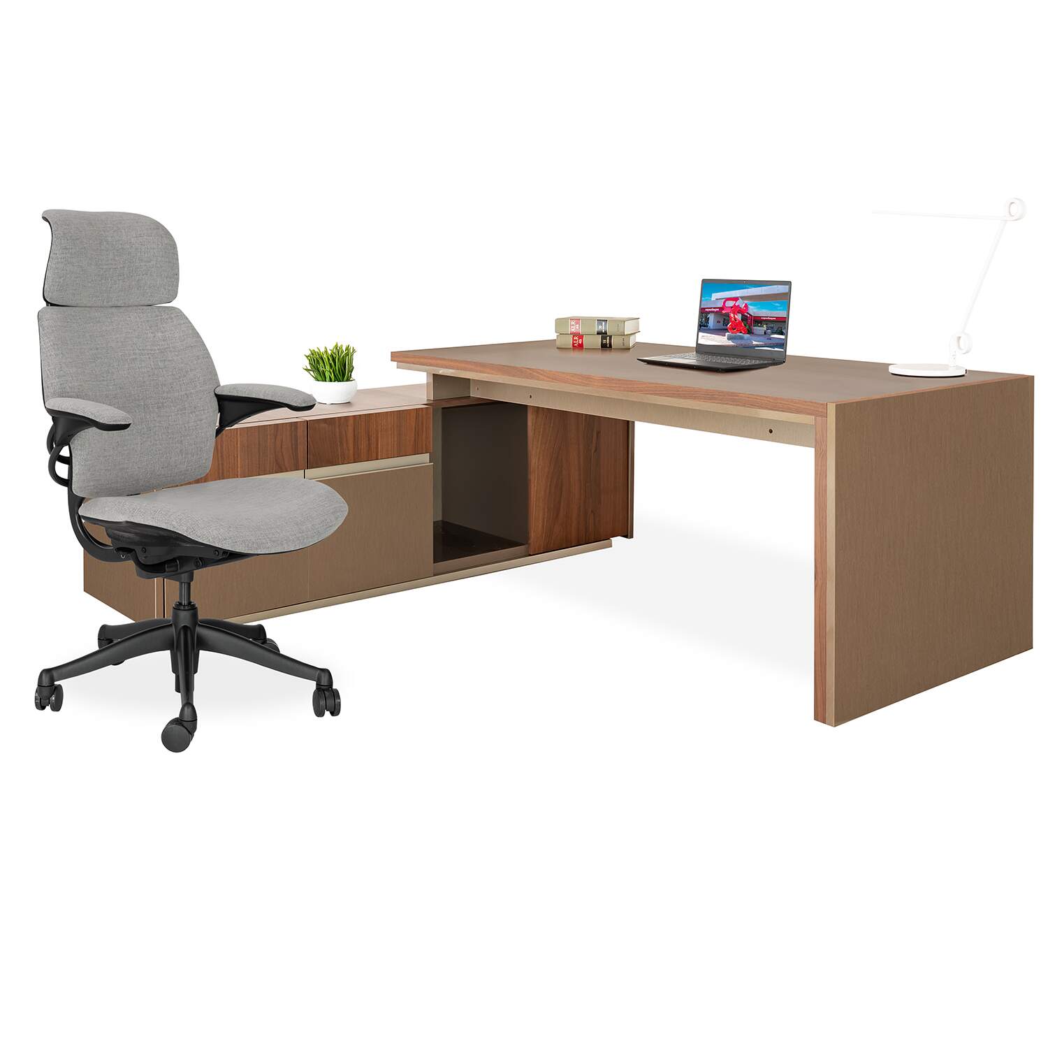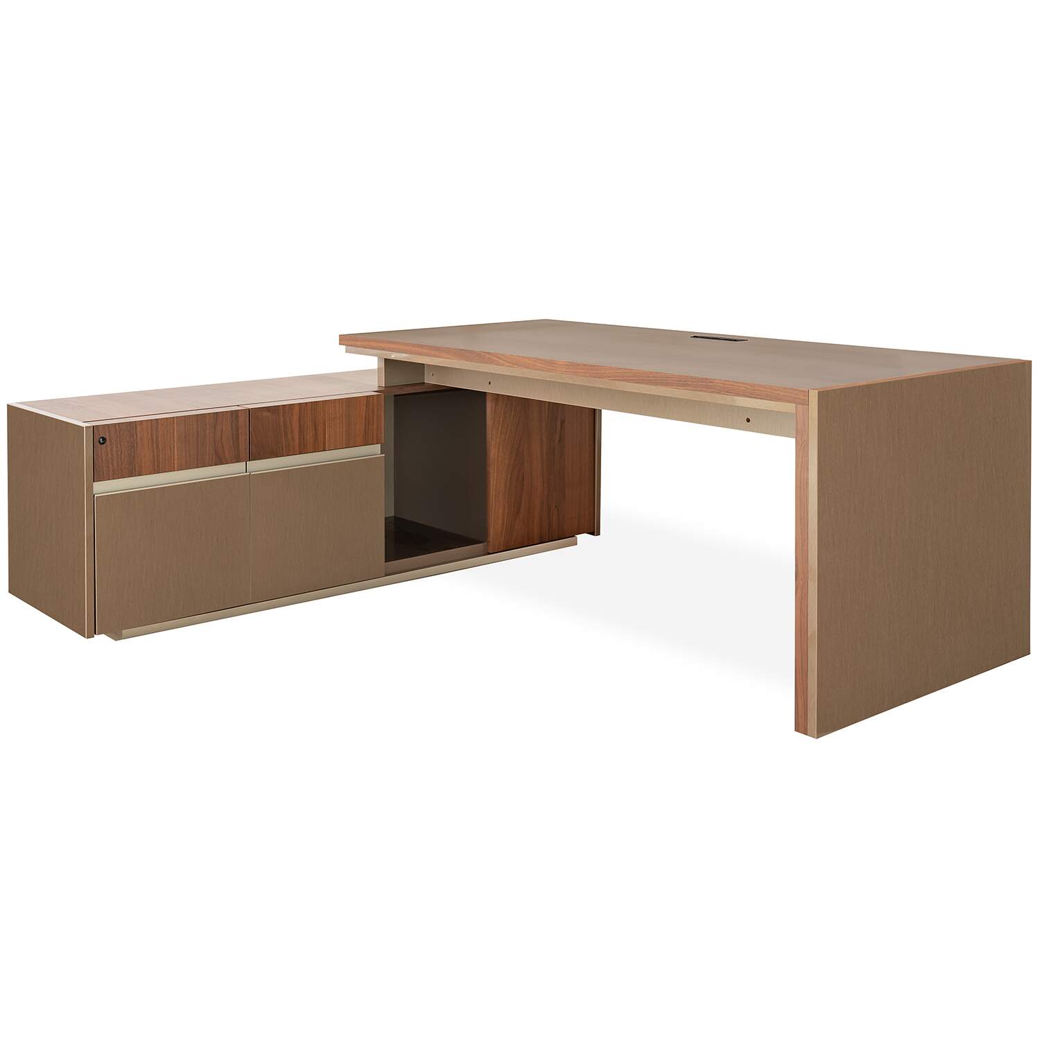 Made in Italy, the Porta Romana office collection combines warm, rich finishes to bring you a workspace that is elegant yet functional. The Porta Romana Executive Desk, available in walnut veneer with brushed bronze high gloss, is designed to complement any Porta Romana office piece. This spacious L-shaped desk with a clean-lined silhouette features a lower storage section that includes one back cabinet, two drawers, and two lockable file drawers that provide ample storage while maintaining a clean, elegant silhouette.