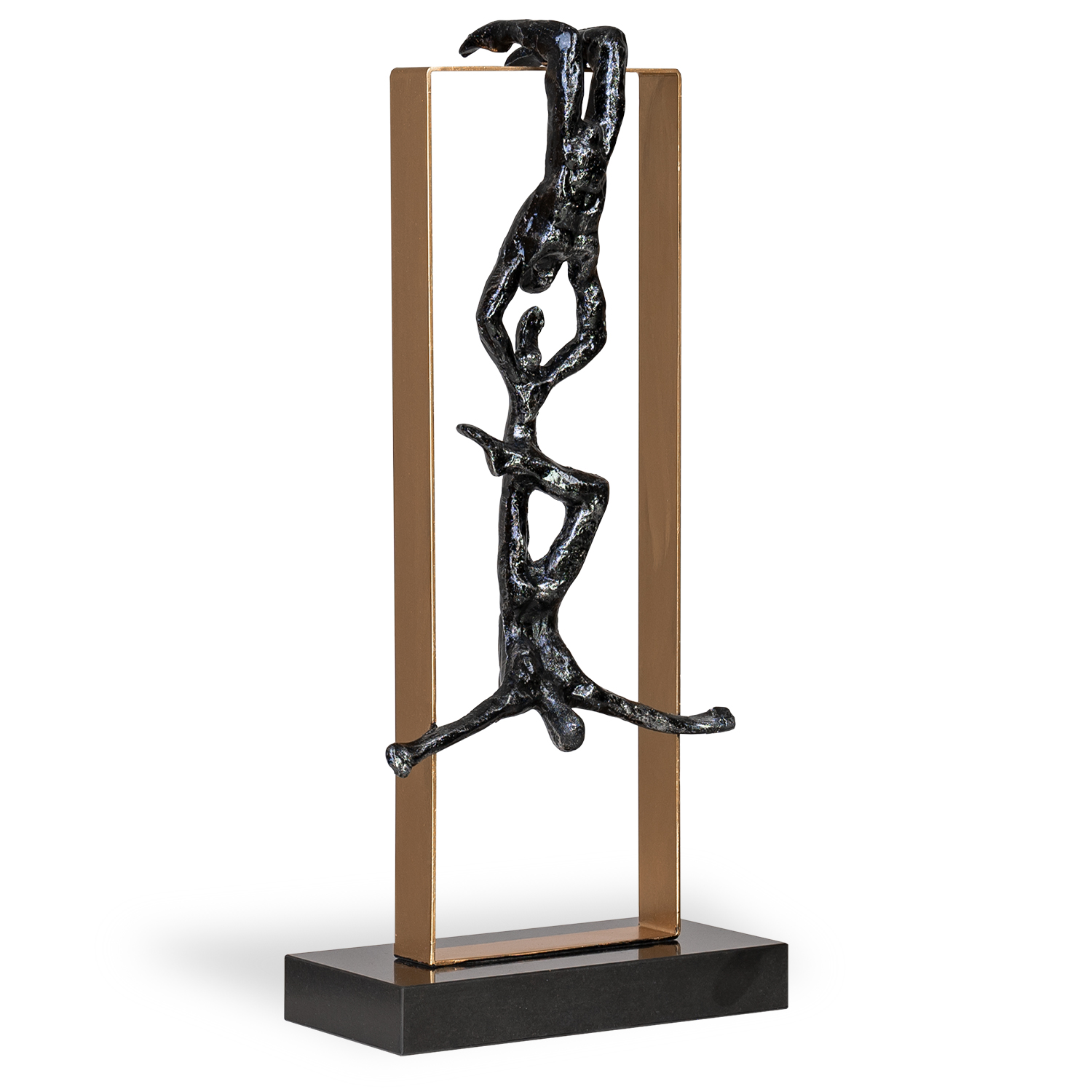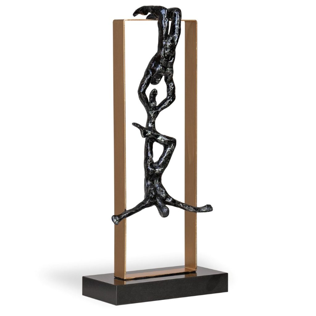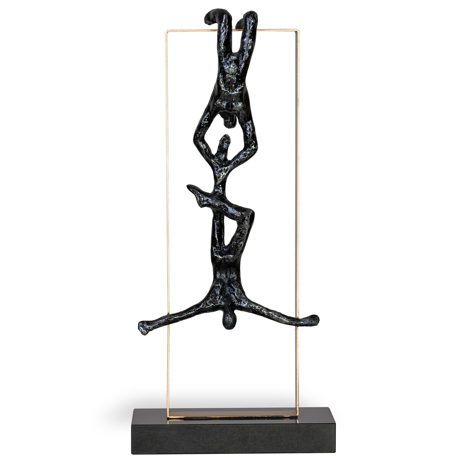 The Powerhouse Sculpture features two figures hanging in an acrobatic pose from a brass rectangular frame. Both made of resin with a hand-painted silver finish, one figure hangs by their knees from the top of the frame and grabs the second figure by their ankle in a feat of mutual strength and grace. A black stone base makes this sculpture ready to display on any tabletop, desk, or bookshelf.