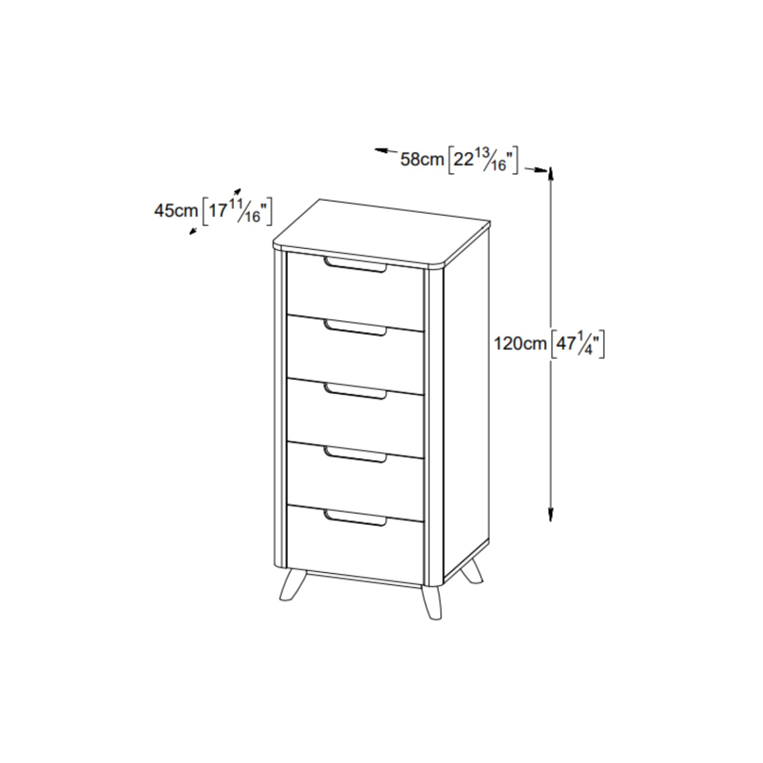 The Prescott 5-Drawer Chest features American solid walnut veneer that creates warmth in any contemporary bedroom. Its five spacious drawers provide ample storage space for smaller items such as socks, with the drawer handles smoothly carved into the wood. The rounded, angled legs add a mid-century modern feel to this classic and contemporary piece, while its style is also neutral enough to fit in a more traditional design environment.
