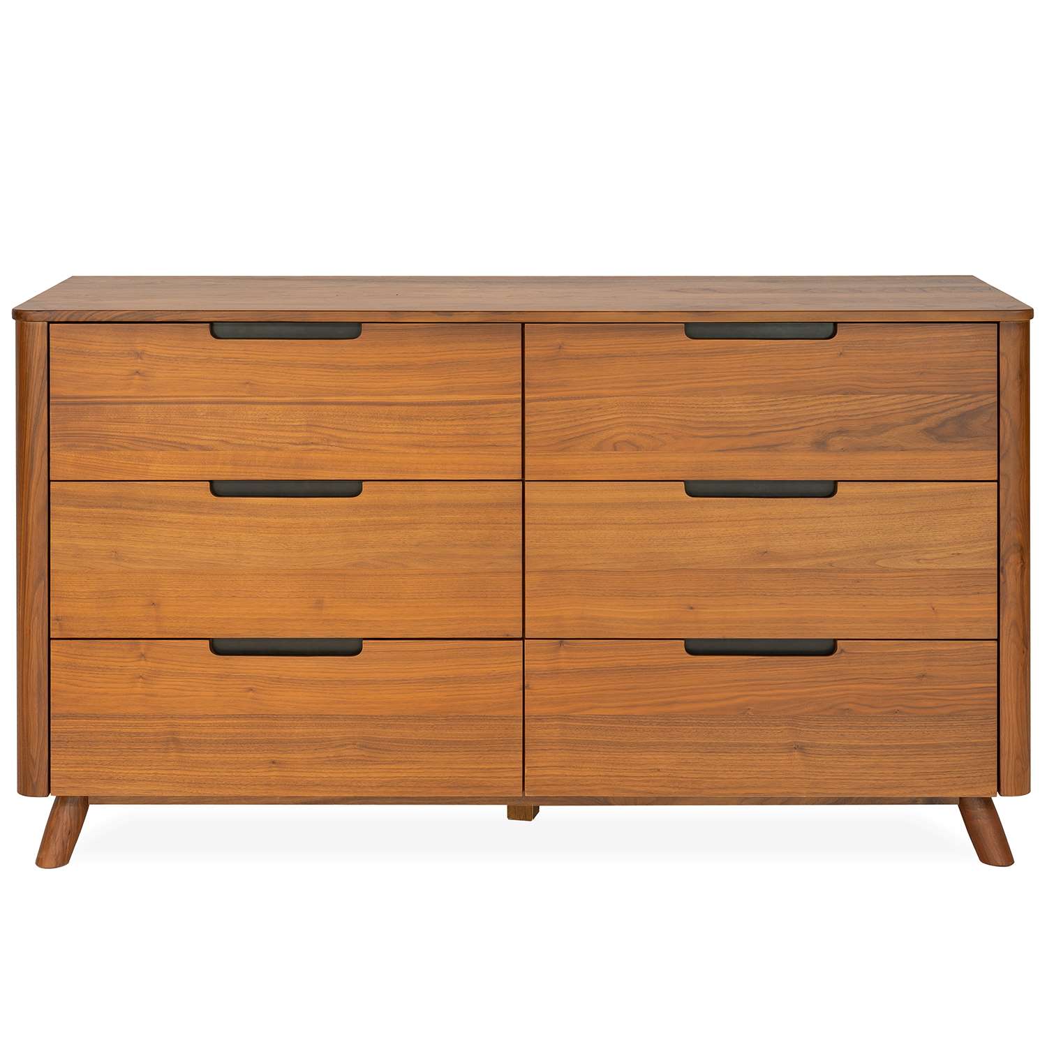 [0] => The Prescott Six Drawer Double Dresser features American solid walnut veneer that creates warmth in any contemporary bedroom. Its six spacious drawers provide ample storage space for clothing, with the drawer handles smoothly carved into the wood. The rounded, angled legs add a mid-century modern feel to this classic and contemporary piece, while its style is also neutral enough to fit in a more traditional design envrionment.