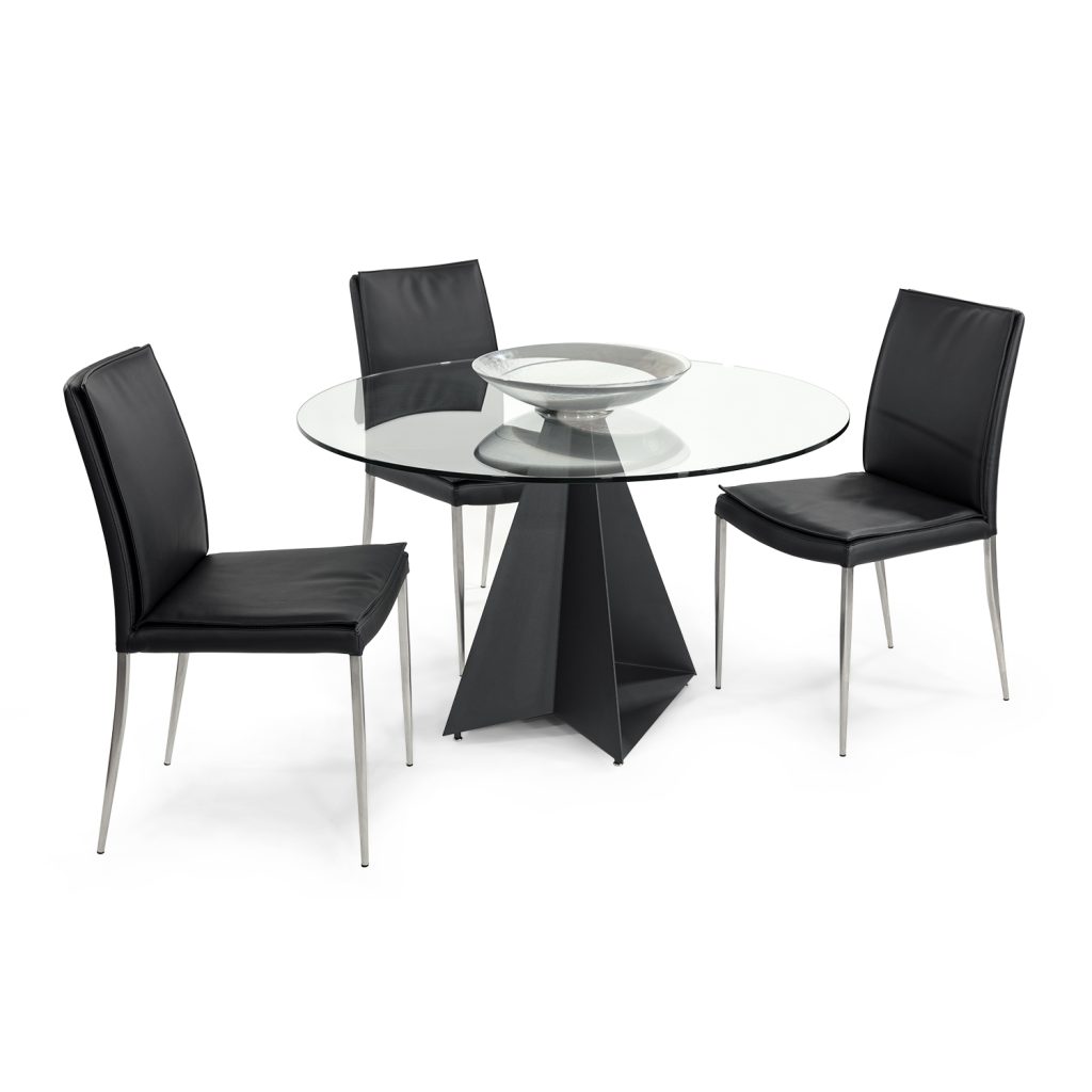 Featuring a sculptural triangular base in carbon black steel and a round tempered glass tabletop, the Prism Dining Table is contemporary and urban. The angular, geometric lines of the base create an industrial look, while the glass tabletop, secured to the base via a stainless-steel disk, allows the form of the base to be appreciated at any angle. Prism's stylish design makes it a good fit for any contemporary home.