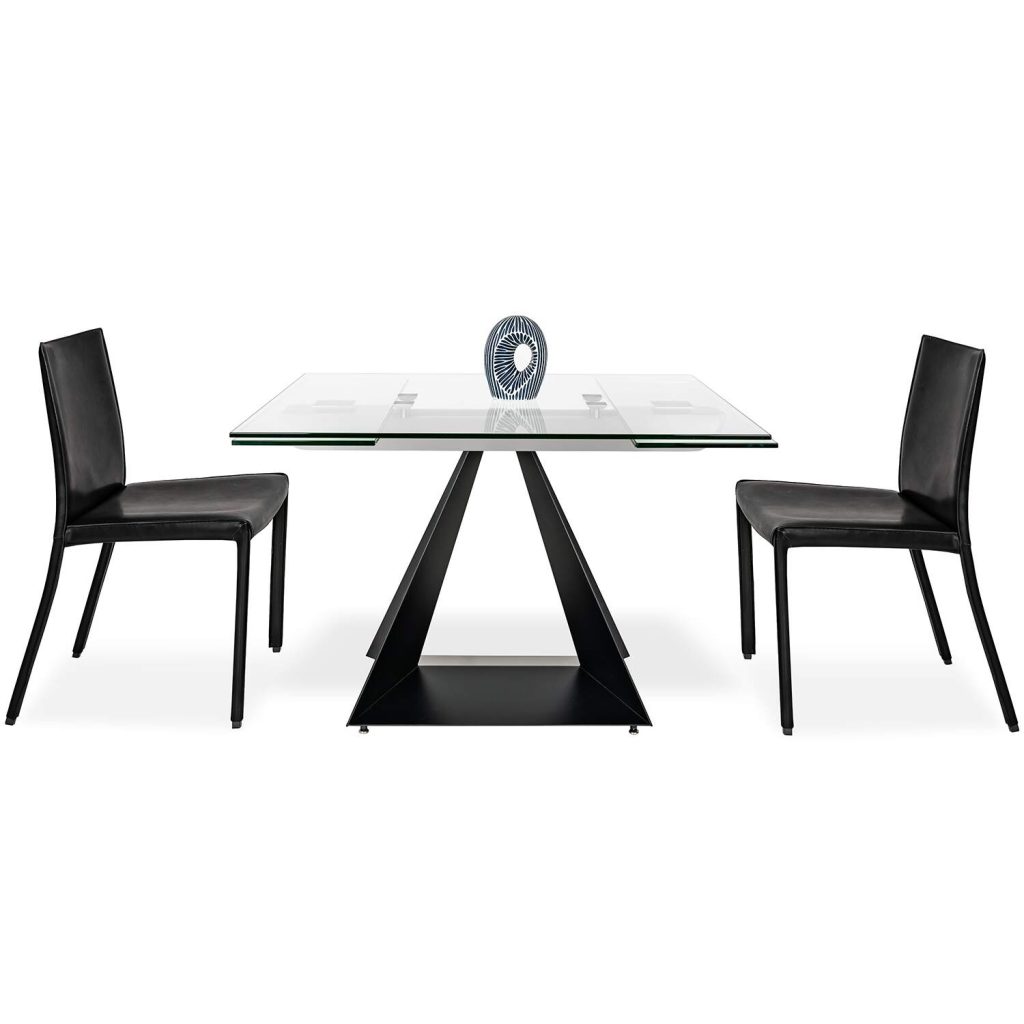 Featuring a sculptural triangular base in carbon black steel and an extendable tempered glass tabletop, the Prism Dining Table is contemporary and urban. The angular, geometric lines of the base create an industrial look, while the glass tabletop, secured to the base via a stainless-steel disk, allows the form of the base to be appreciated at any angle. Prism's stylish design makes it a good fit for any contemporary home.