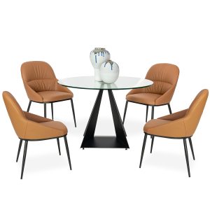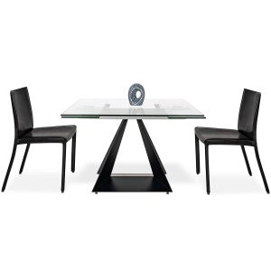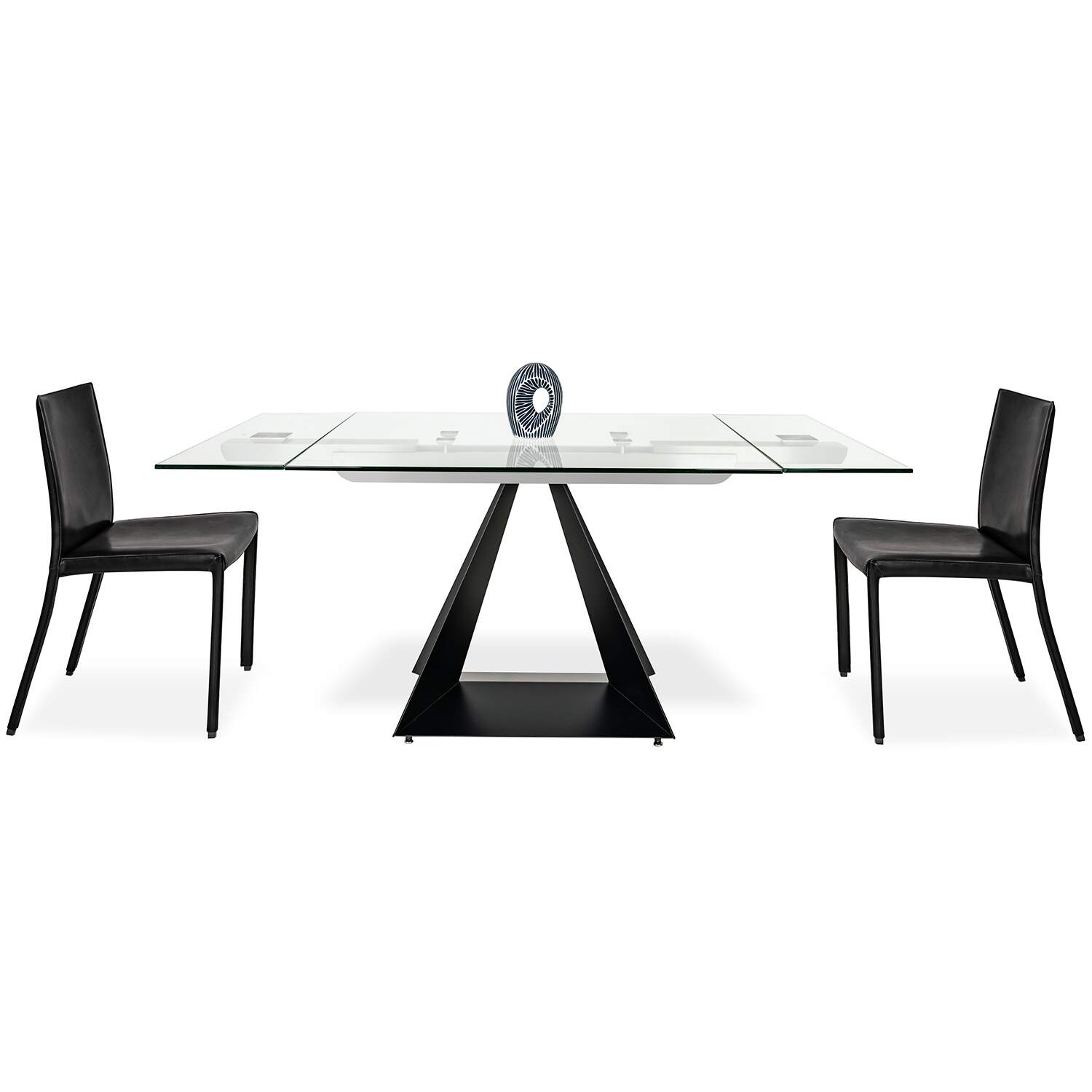 [0] => Featuring a sculptural triangular base in carbon black steel and an extendable tempered glass tabletop, the Prism Dining Table is contemporary and urban. The angular, geometric lines of the base create an industrial look, while the glass tabletop, secured to the base via a stainless-steel disk, allows the form of the base to be appreciated at any angle. Prism's stylish design makes it a good fit for any contemporary home.