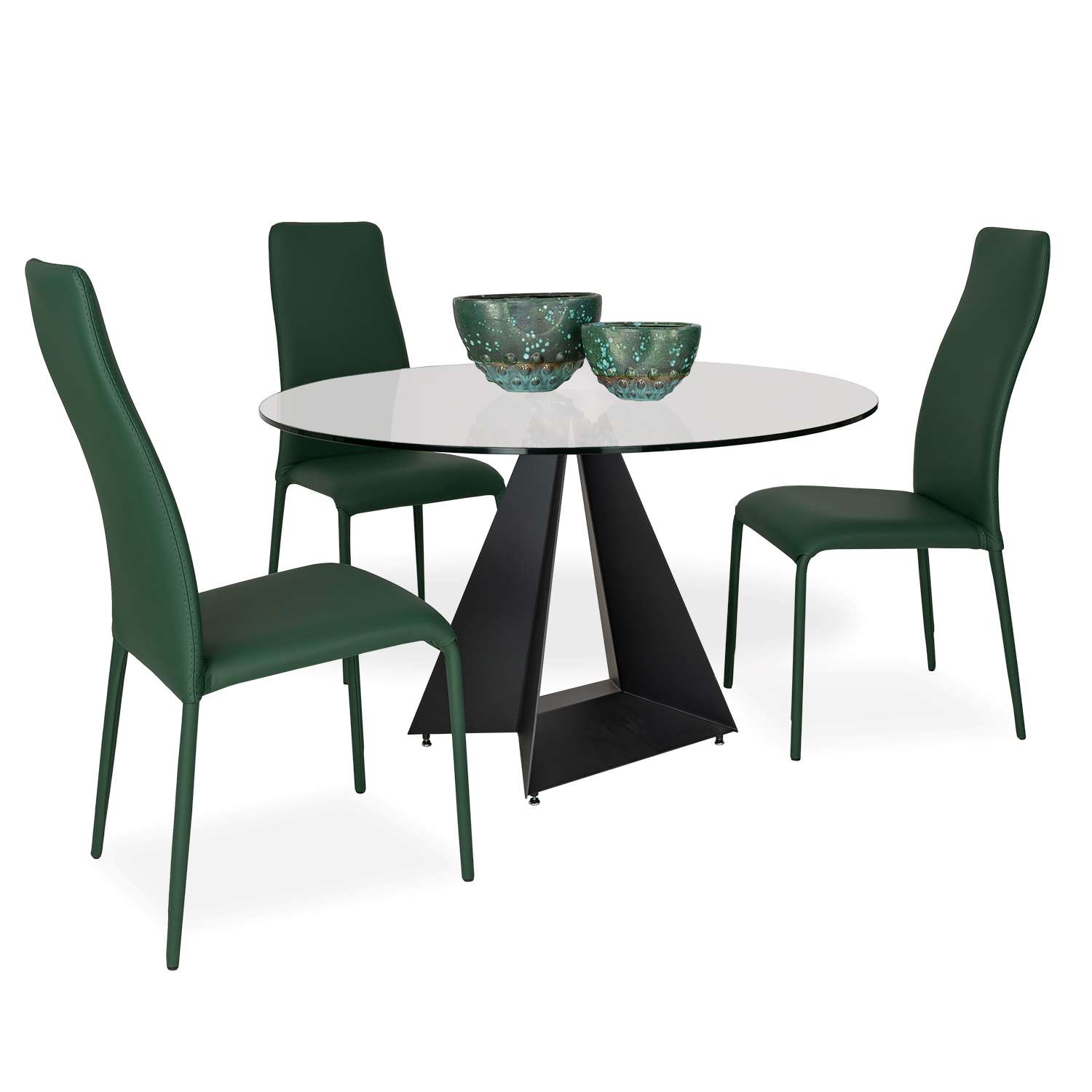 [0] => Featuring a sculptural triangular base in carbon black steel and a round tempered glass tabletop, the Prism Dining Table is contemporary and urban. The angular, geometric lines of the base create an industrial look, while the glass tabletop, secured to the base via a stainless-steel disk, allows the form of the base to be appreciated at any angle. Prism's stylish design makes it a good fit for any contemporary home.