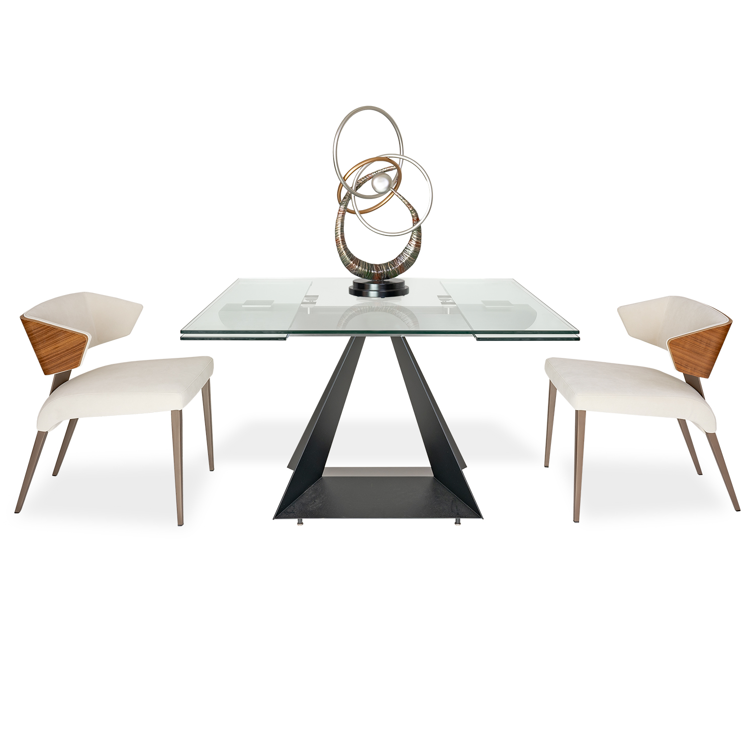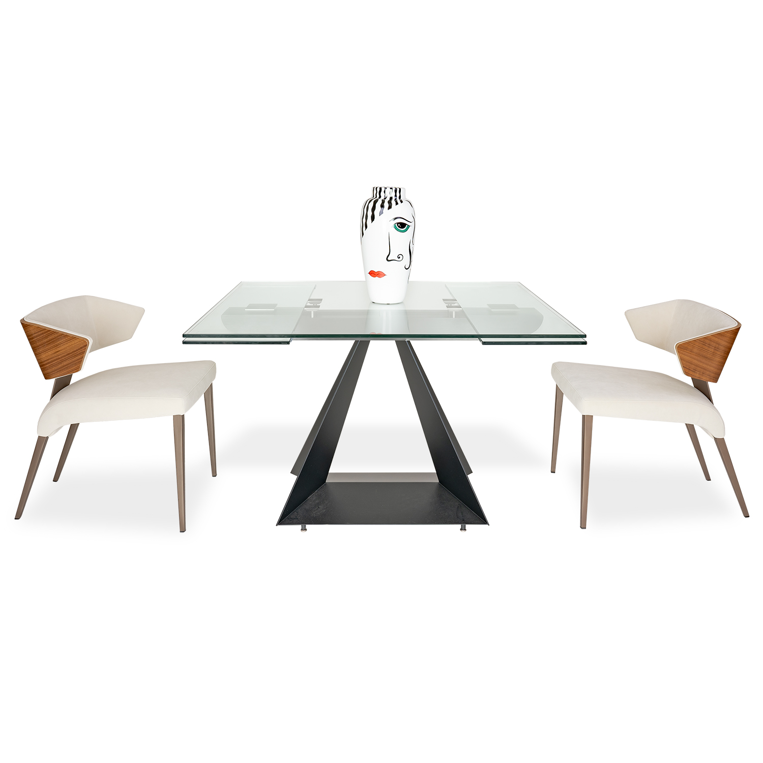 Featuring a sculptural triangular base in carbon black steel and a round tempered glass tabletop, the Prism Dining Table is contemporary and urban. The angular, geometric lines of the base create an industrial look, while the glass tabletop, secured to the base via a stainless-steel disk, allows the form of the base to be appreciated at any angle. Prism's stylish design and functional extension panels make it a great choice for contemporary dining and entertaining.