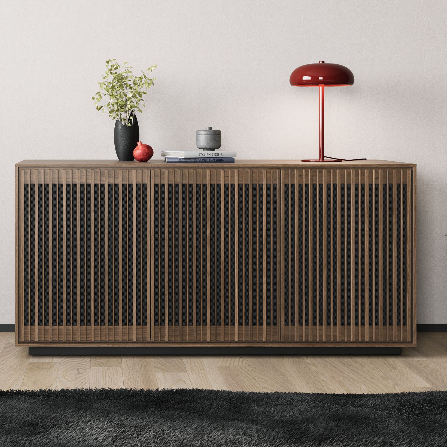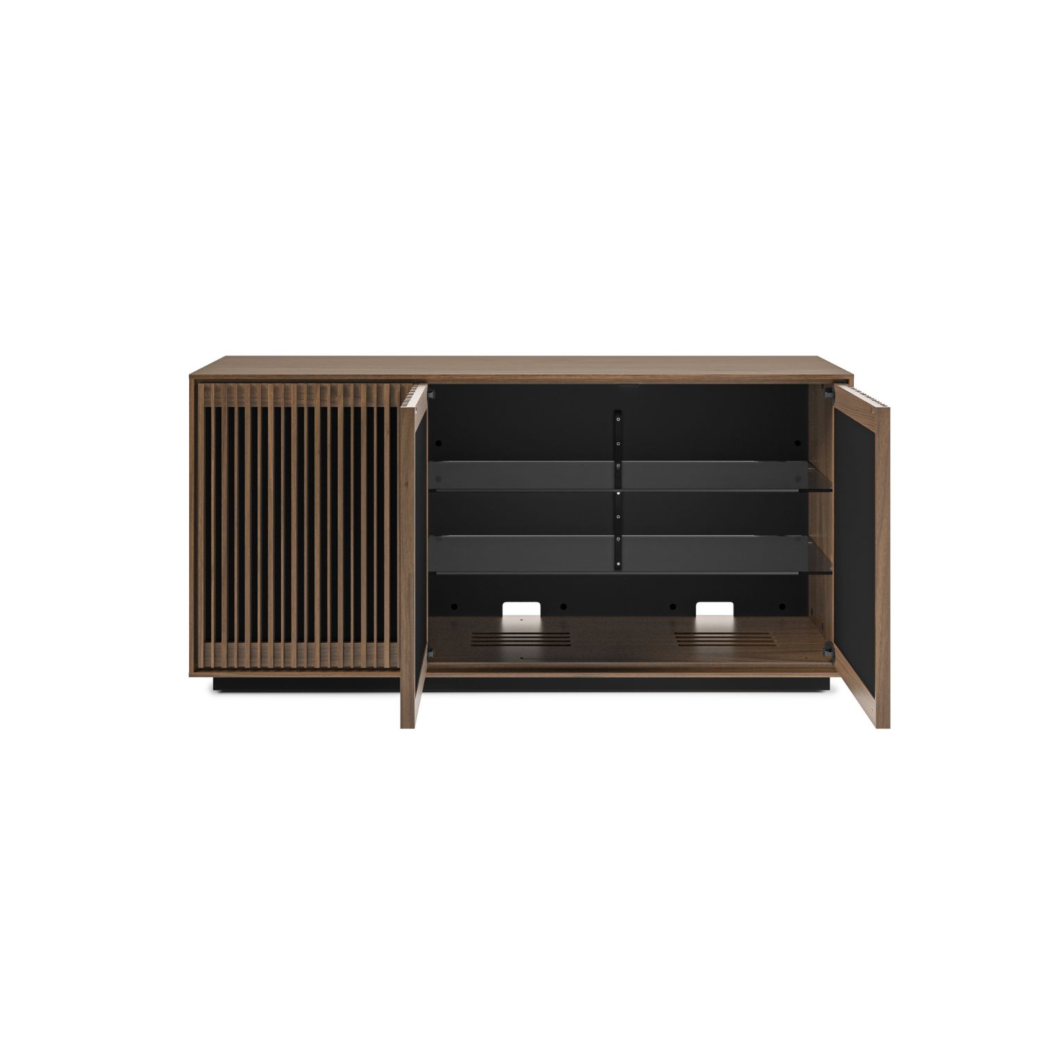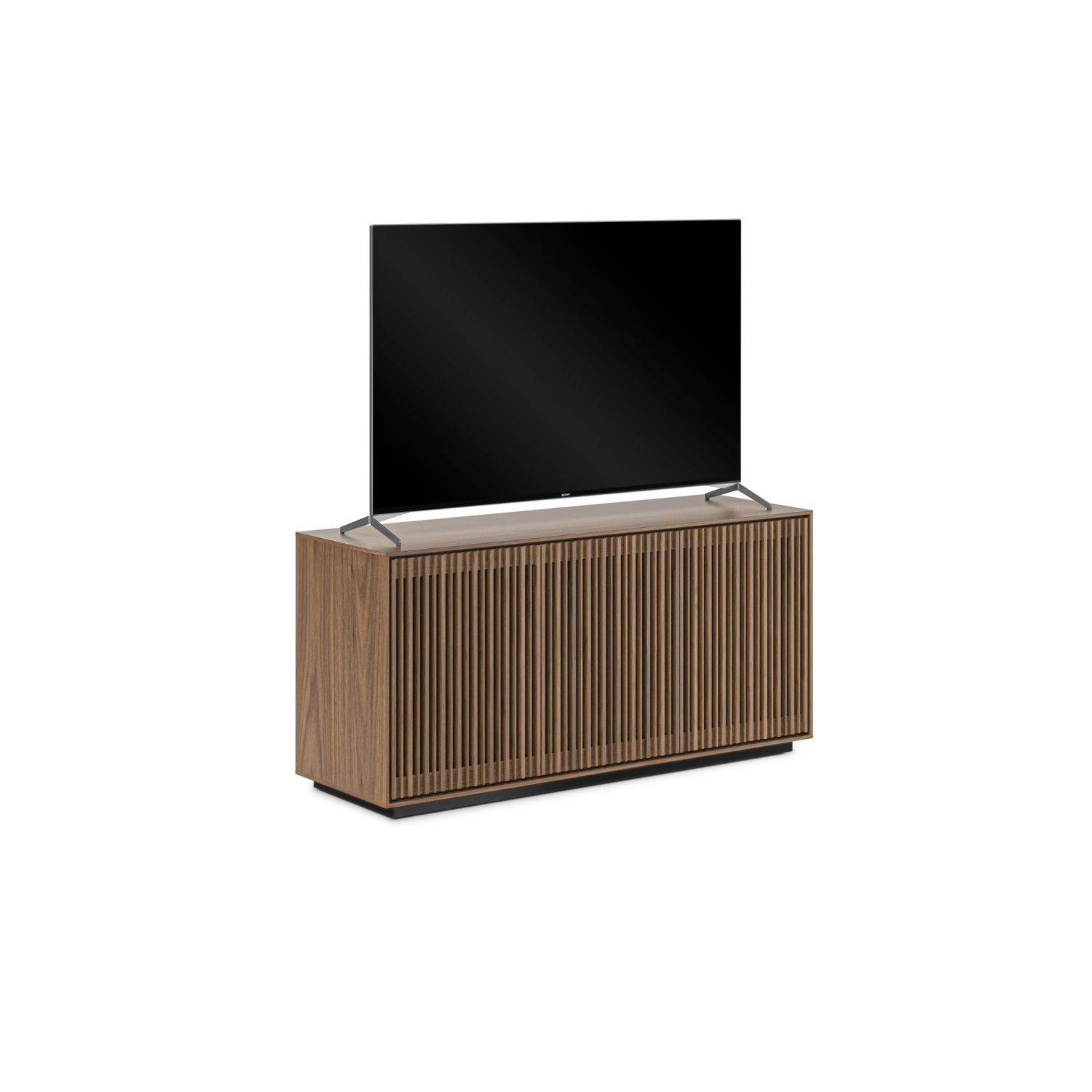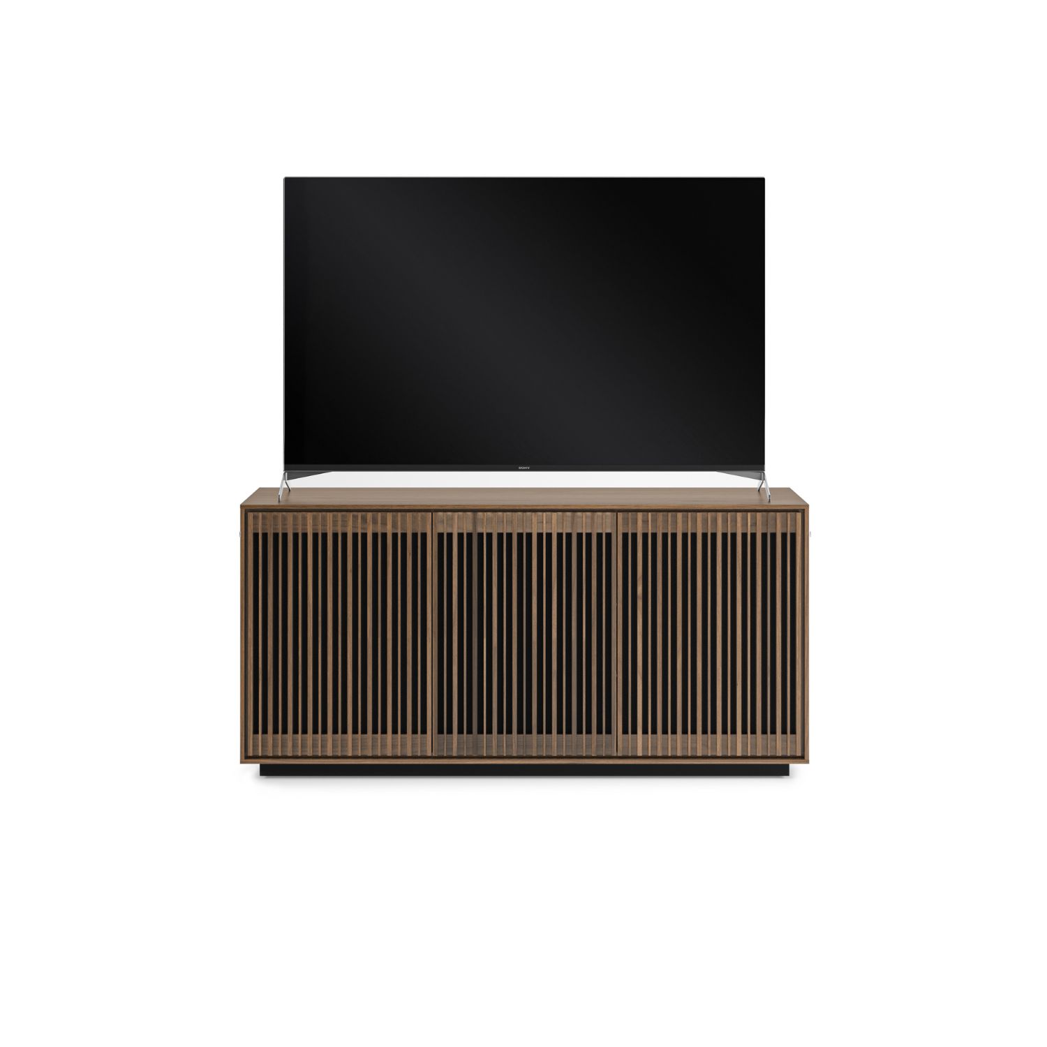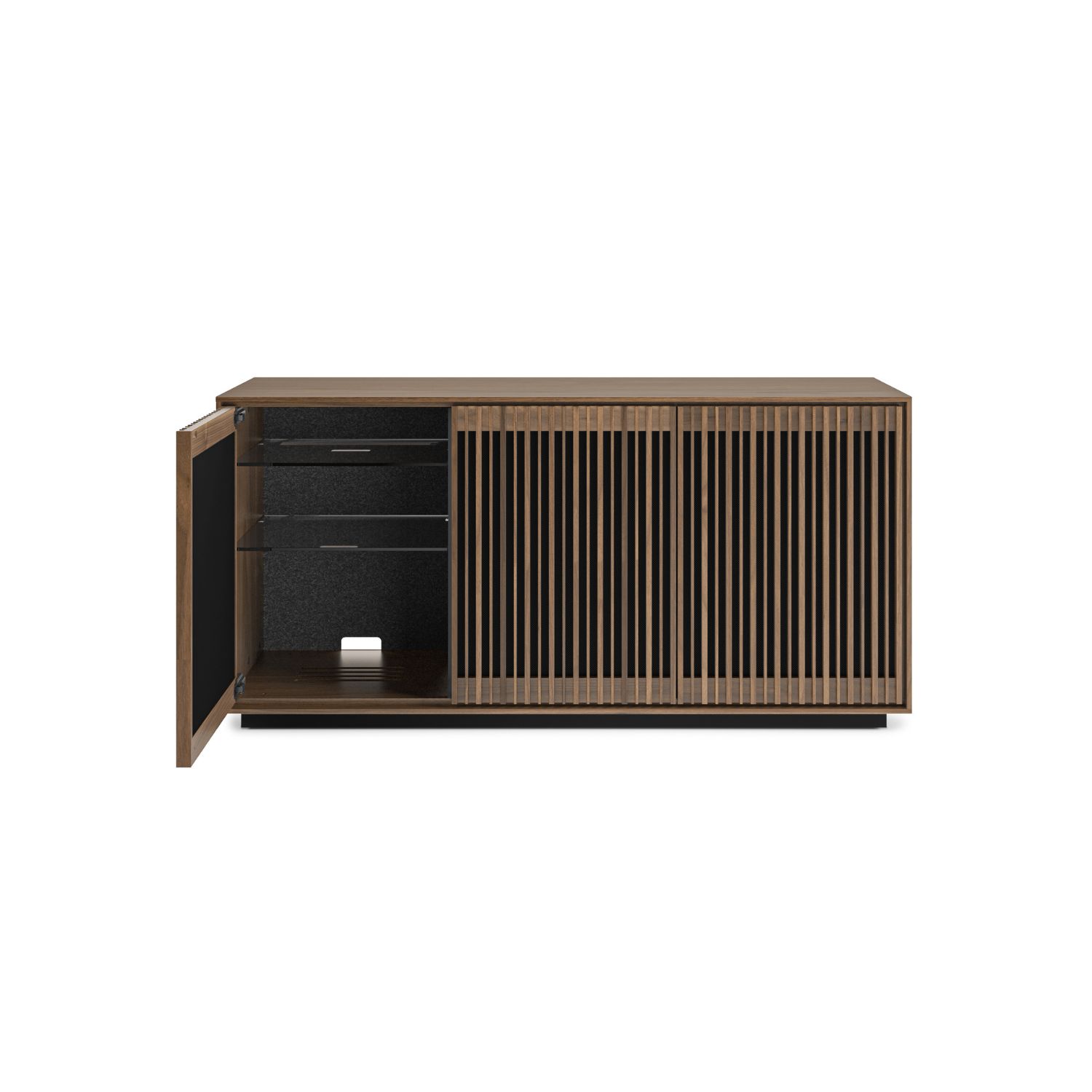 Inspired by mid-century modern design, the Profile 3-Door Cabinet blends clean lines and a natural walnut finish with a plethora of intuitive features that make it fully contemporary. Both elegant and functional, Profile's slatted doors catch the eye while allowing for ventilation, acoustic transparency, and remote control accessibility. Three soft-close doors conceal spacious inner compartments that can accommodate a variety of electronic gear. Adjustable shelving, wire wraps, discreet wheels, and a rear access panel make it easy to achieve the entertainment setup that's perfectly calibrated to your preferences.