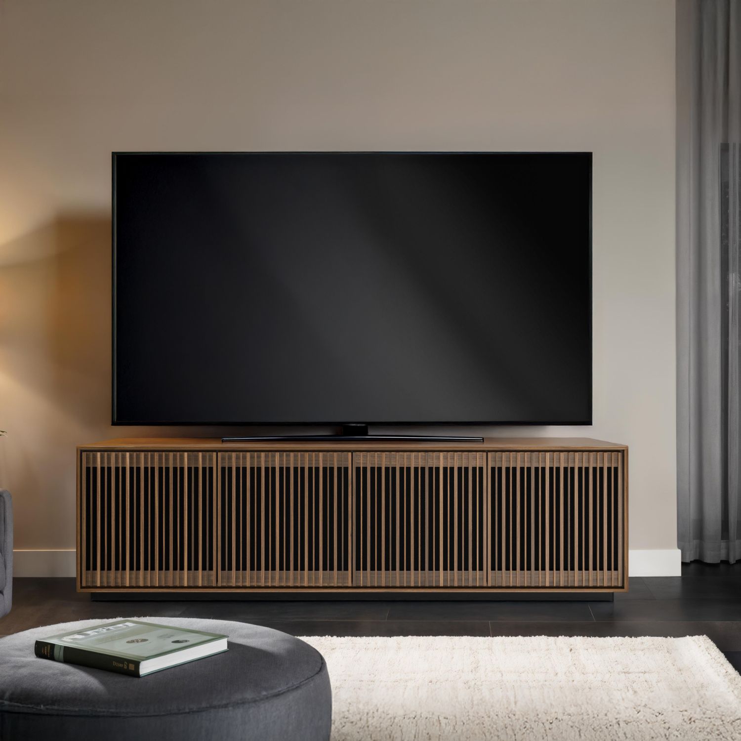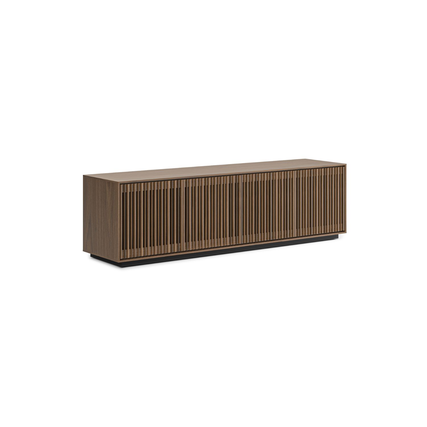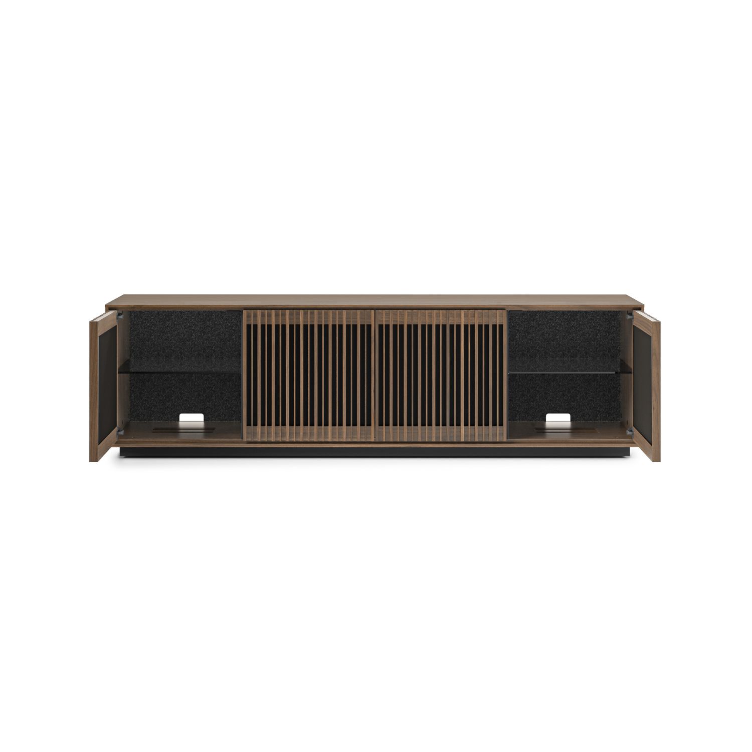 Inspired by mid-century modern design, the Profile 4-Door Cabinet blends clean lines and a natural walnut finish with a plethora of intuitive features that make it fully contemporary. Both elegant and functional, Profile's slatted doors catch the eye while allowing for ventilation, acoustic transparency, and remote control accessibility. The soft-close doors conceal a larger center compartment with a soundbar shelf, and two smaller side compartments that can accommodate a variety of electronic gear. Adjustable shelving, rear access panels, wire wraps, and discreet wheels make it easy to achieve the entertainment setup that's perfectly calibrated to your preferences.
