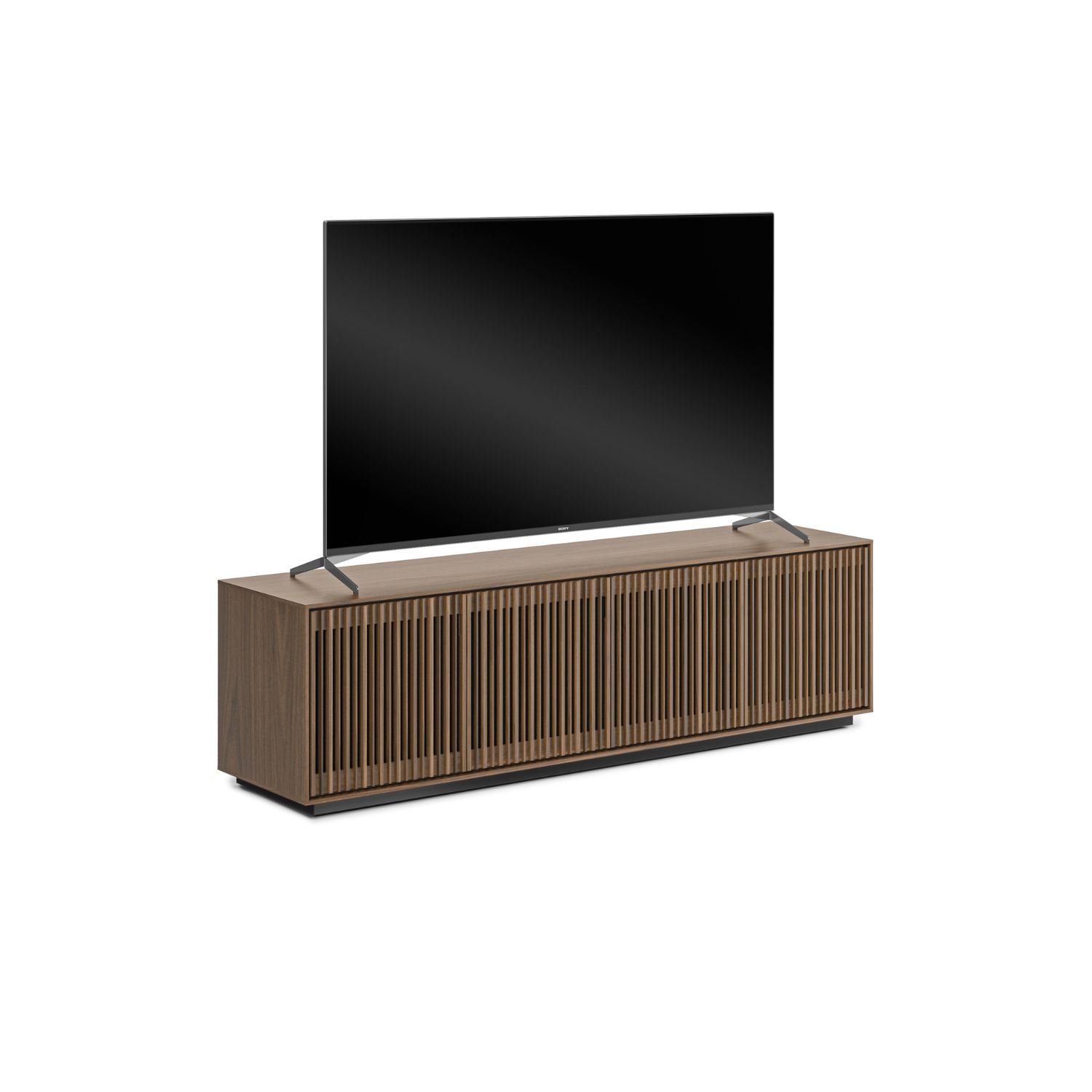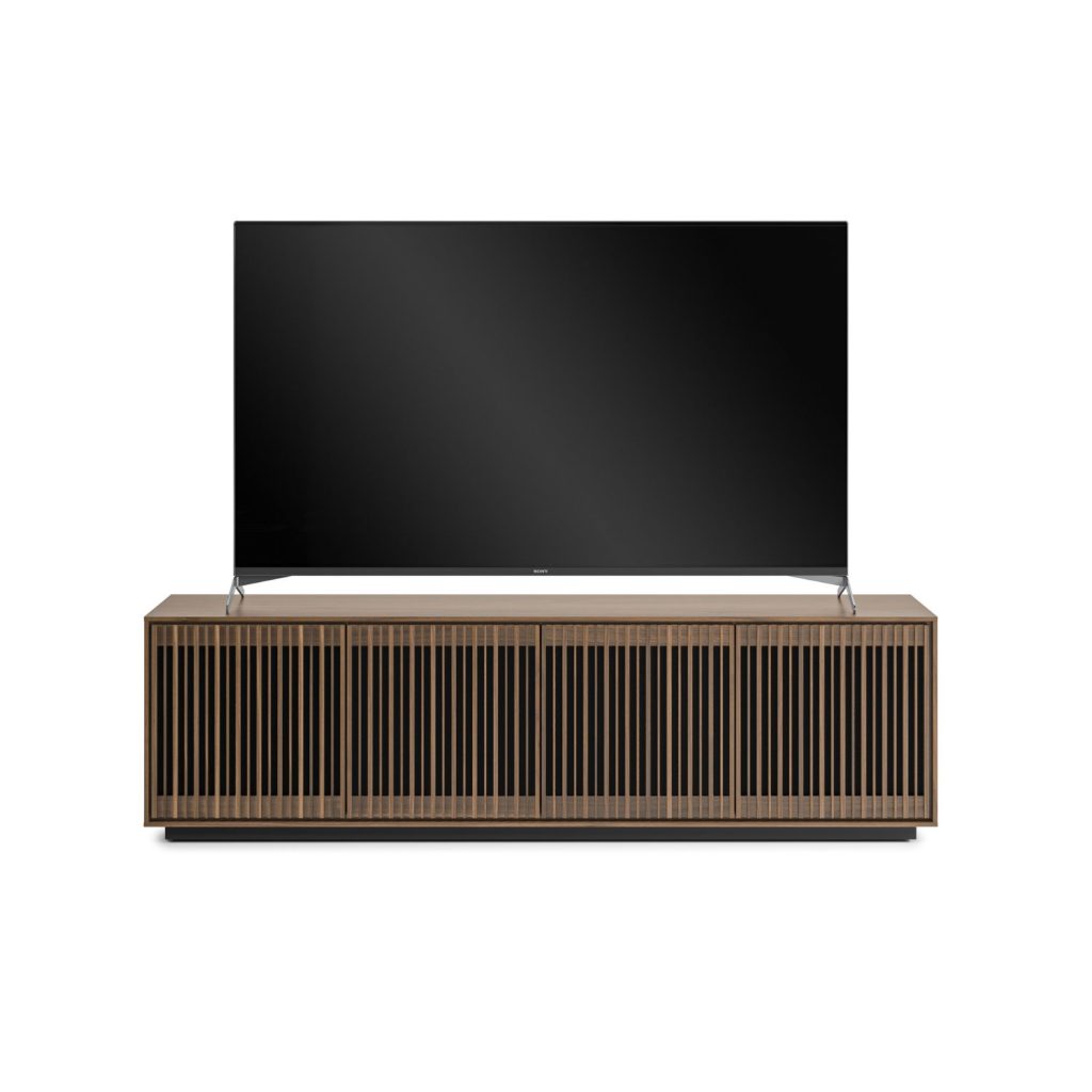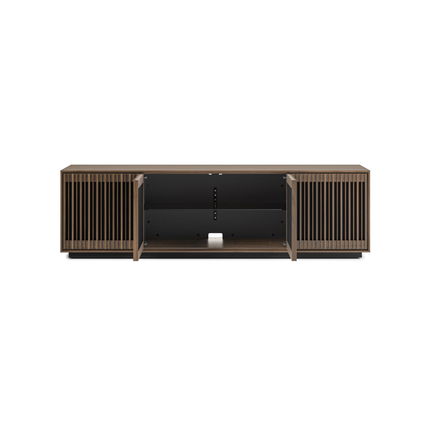 Inspired by mid-century modern design, the Profile 4-Door Cabinet blends clean lines and a natural walnut finish with a plethora of intuitive features that make it fully contemporary. Both elegant and functional, Profile's slatted doors catch the eye while allowing for ventilation, acoustic transparency, and remote control accessibility. The soft-close doors conceal a larger center compartment with a soundbar shelf, and two smaller side compartments that can accommodate a variety of electronic gear. Adjustable shelving, rear access panels, wire wraps, and discreet wheels make it easy to achieve the entertainment setup that's perfectly calibrated to your preferences.