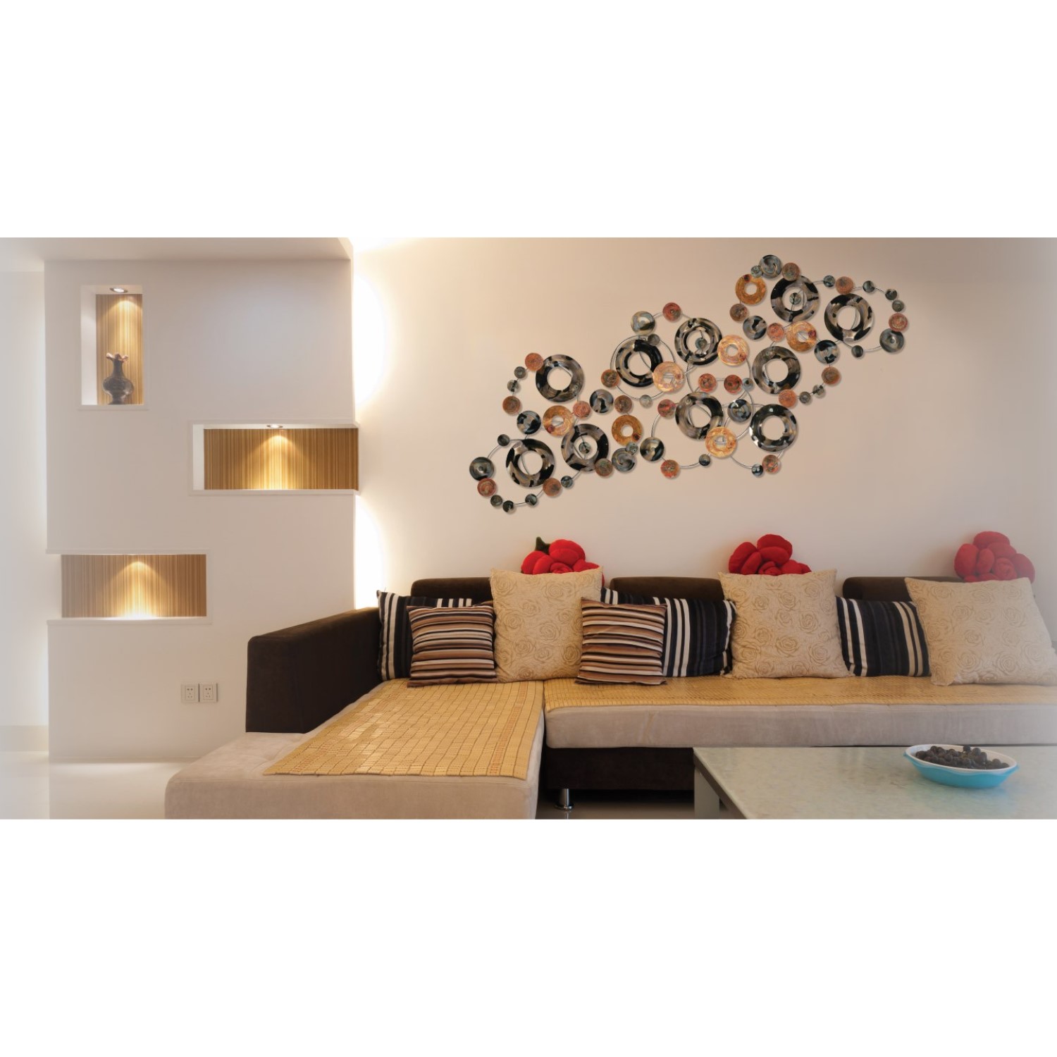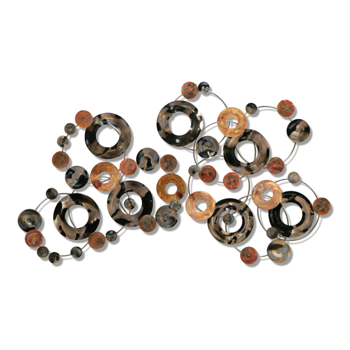 [0] => The Propensity wall art features varying sizes of rings and discs crafted from flame-treated chrome, brass, and copper. Propensity has two separate segments of artistic metalwork, which can be positioned to your liking for a harmonious arrangement.