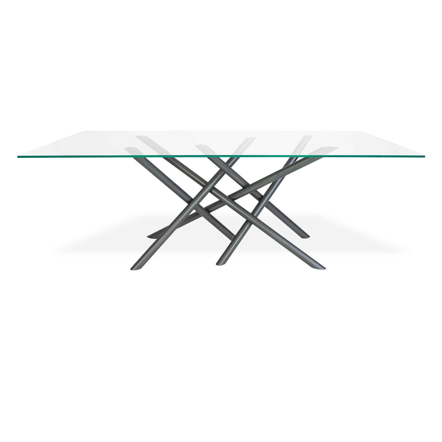 Dine in elegance with the Quantum Dining Table, featuring a gleaming glass top and striking architectural base. Quantum's rectangular tabletop is made of clear Starfire glass and mounted on rubber anchors that give it a floating appearance. The base, wrought from powder-coated anthracite grey metal, consists of six angled, intersecting beams that give this table a dynamic and boldly contemporary look.