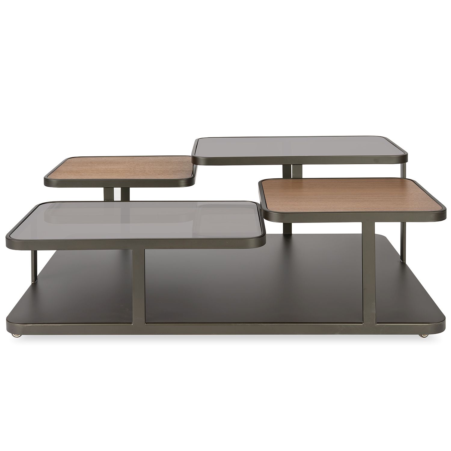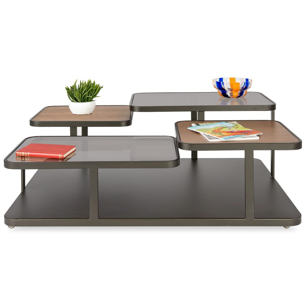 [0] => Designed by Javier Palomares, the Quatro Cocktail Table has an alluringly modern structure that features four rectangular tabletops built at a variety of heights. Quatro's larger tops are made of clear glass that forms a pleasing contrast to the walnut veneer of the smaller tops. The frame and base in dark grey steel offer sturdy support, while built-in wheels provide effortless mobility. With plenty of room to place reading materials, remotes, beverages, snacks, and decor, Quatro presents a bold, eclectic design perfect for contemporary homes.