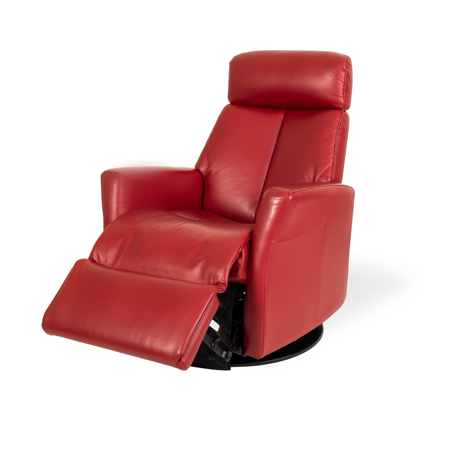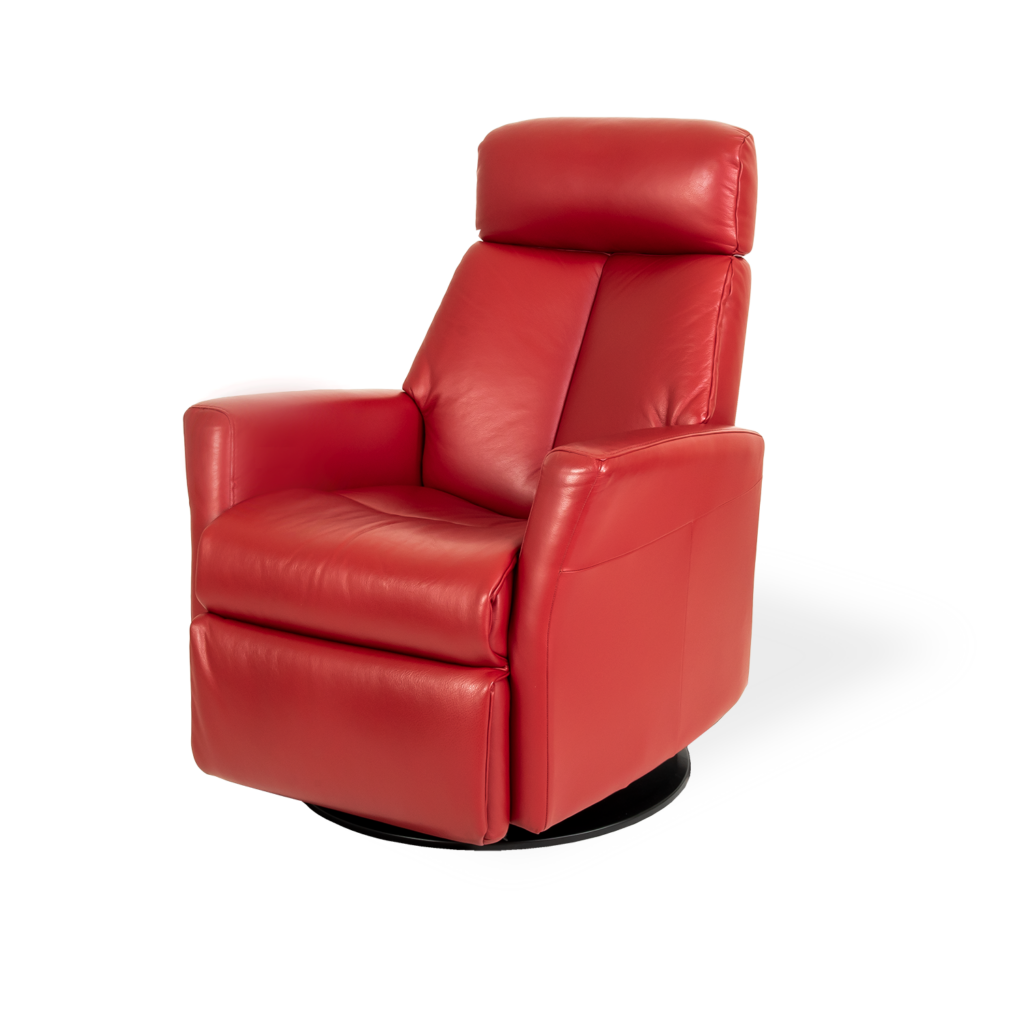 The Queen Standard Recliner, available with power motion technology, combines comfort and relaxation with a sleek and sophisticated look. At the touch of a button, recline the back and footrest, or stay upright and enjoy Queen's gliding and swiveling functions. Use the manually adjustable headrest to choose the perfect height and angle for your head and neck. Upholstered in chili red leather, the Queen Recliner is made with cold-cure molded foam cushioning, and engineered with correct body posture in mind at every step.