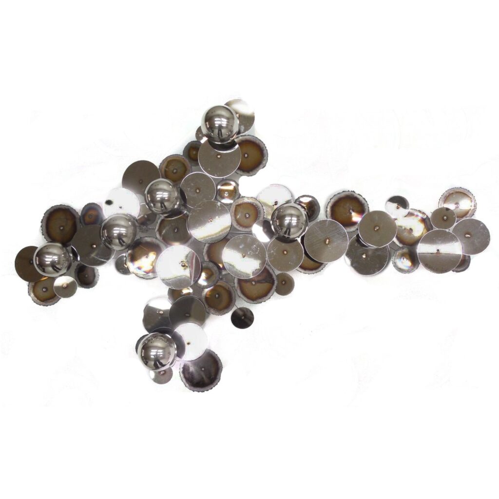 The Raindrops Small Silver Wall Art is a sculpture full of reflective surfaces and organic shapes. This piece is an aggregation of metal discs, some flat and some domed, made of polished flame colored stainless steel. Hang it on the wall of your office, living room, or foyer to remind you of the feeling of walking into the world after it has rained.