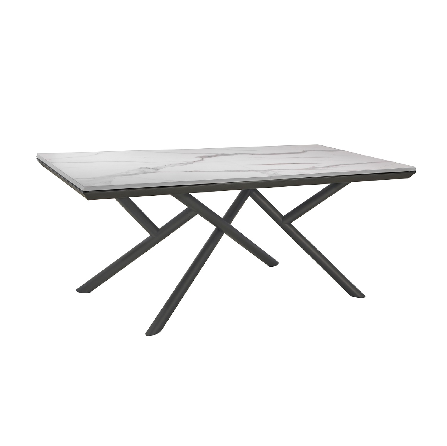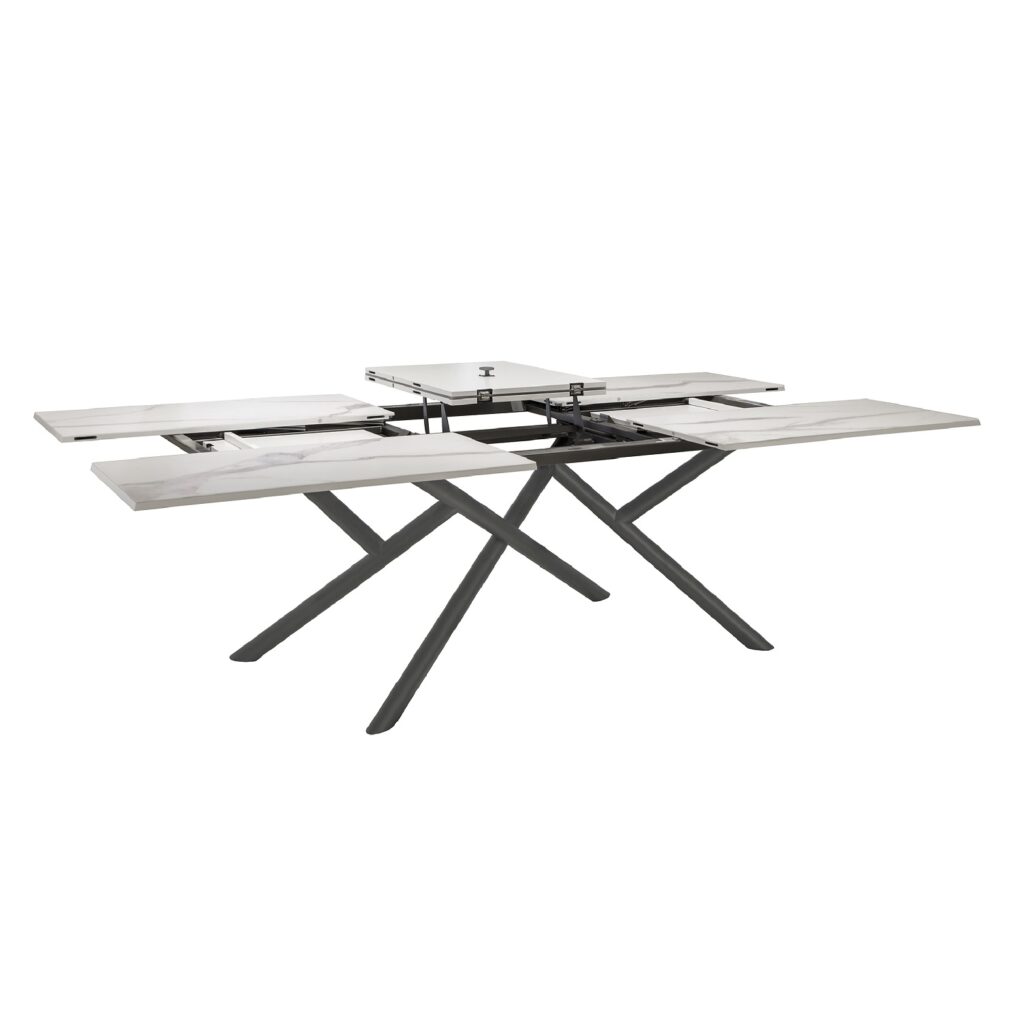 [0] => The Random Dining Table features a luxurious matte graphite tabletop, infused with Calacatta gold designs. Made in Italy, this table features cutting-edge functional design; the table expands beautifully, with all four corners sliding out to reveal discretely stored leaves underneath. A sculptural triangular base with four heavy legs adds another layer of opulence.