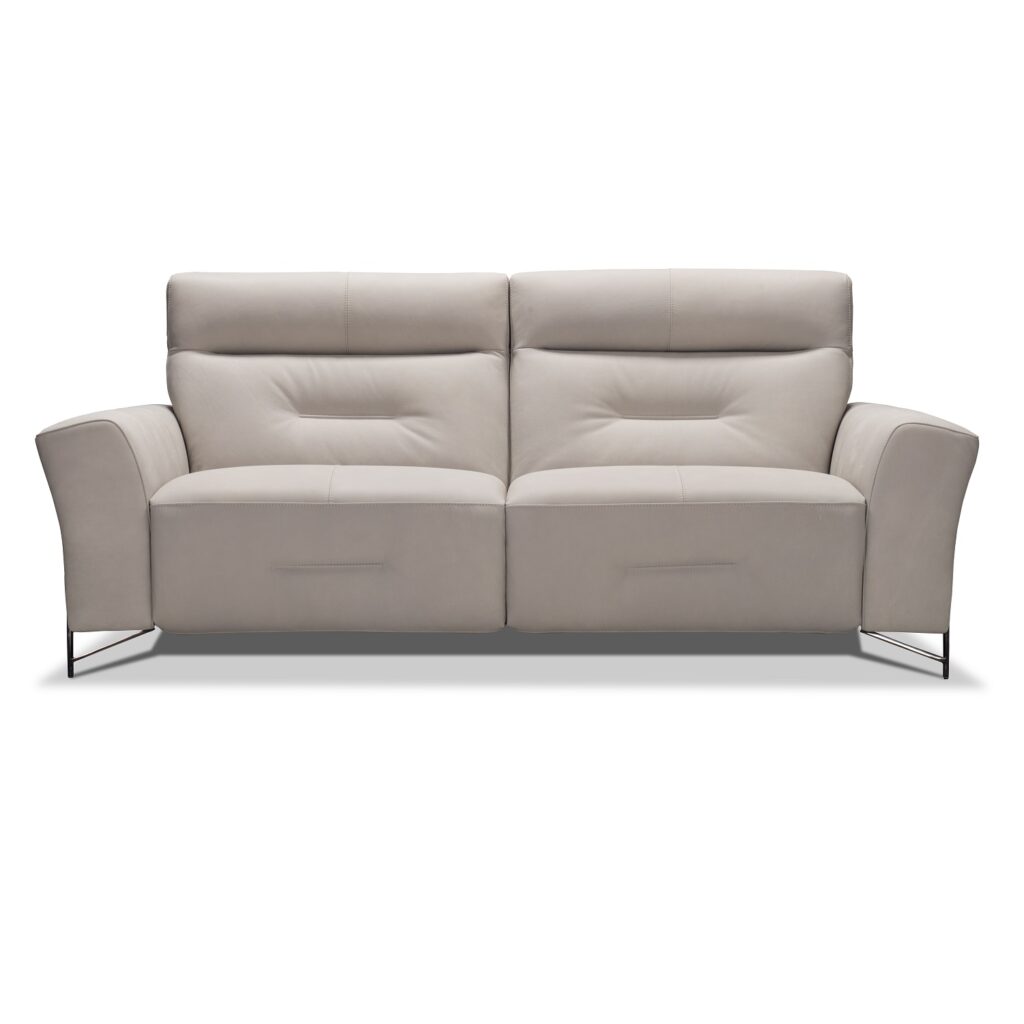 [0] => The Rebecca Power Motion Sofa, made in Italy, features top-grain light grey leather upholstery and matte black legs. Its dual-motor electric reclining mechanism allows you to adjust the headrest and reclining positions of each seat independently, via discrete buttons on either side. Rebecca's arms have a subtle curve that enhances your comfort, while matching stitching attractively accents the back and seats. A contemporary power motion sofa that is both comfortable and functional.