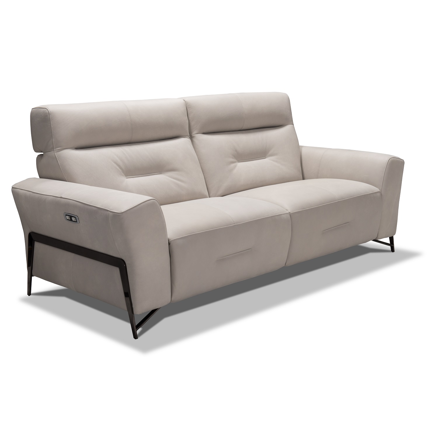 The Rebecca Power Motion Sofa, made in Italy, features top-grain light grey leather upholstery and matte black legs. Its dual-motor electric reclining mechanism allows you to adjust the headrest and reclining positions of each seat independently, via discrete buttons on either side. Rebecca's arms have a subtle curve that enhances your comfort, while matching stitching attractively accents the back and seats. A contemporary power motion sofa that is both comfortable and functional.