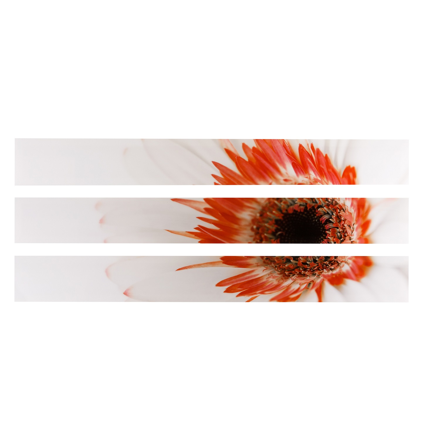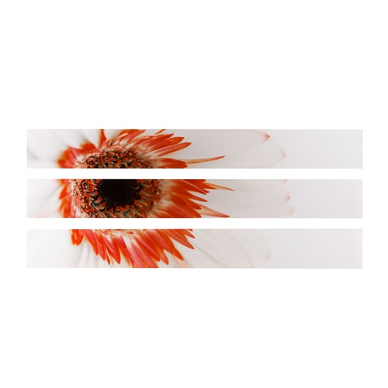 [0] => Red Flower is divided into three separate panels for a stunning look when hung. This piece can be mounted so the main flower image appears either to the left looking down or right looking up. Includes pre-attached cleats for mounting in either orientation. Each panel measures 96" x 12".