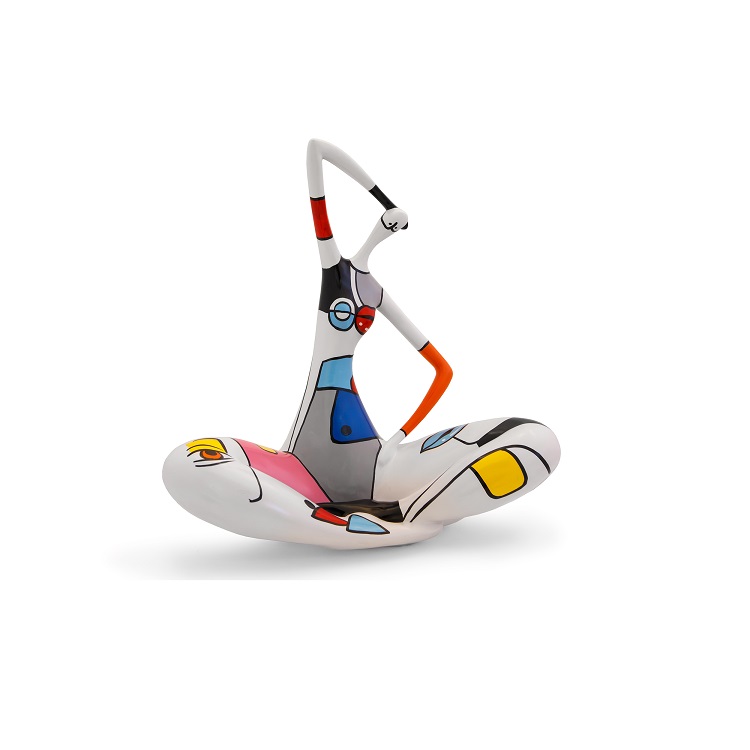 The Relaxed Girl sculpture sits comfortably with crossed legs, stretching and unwinding the body. She has pop-art style lips and eyes along her body in cool hues.
