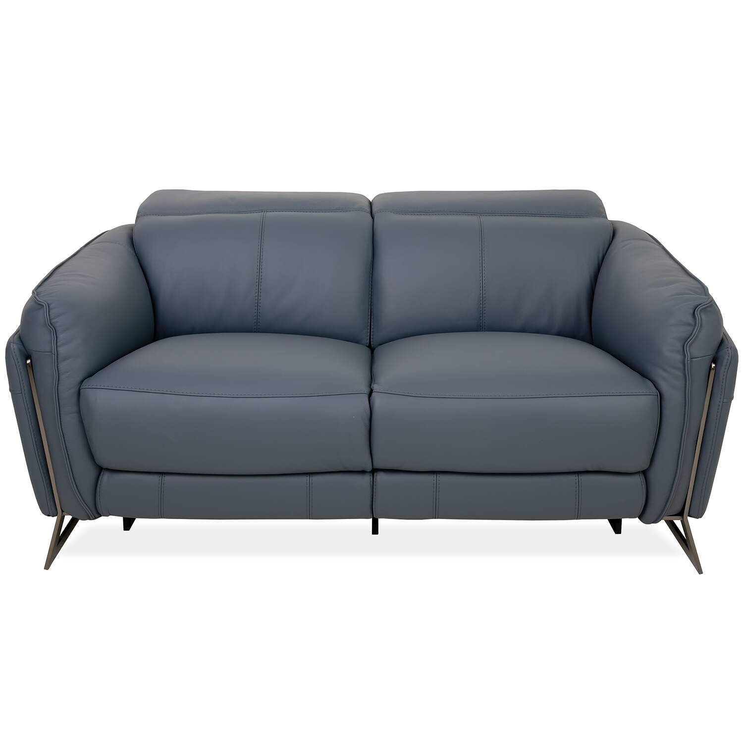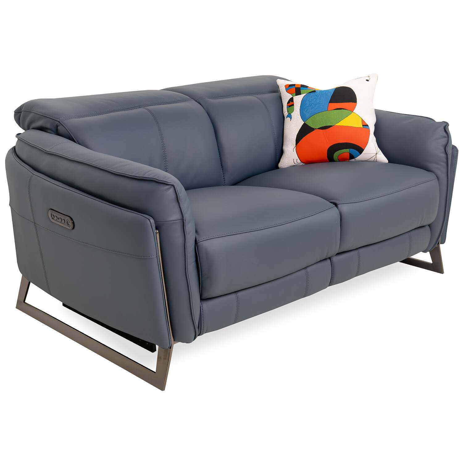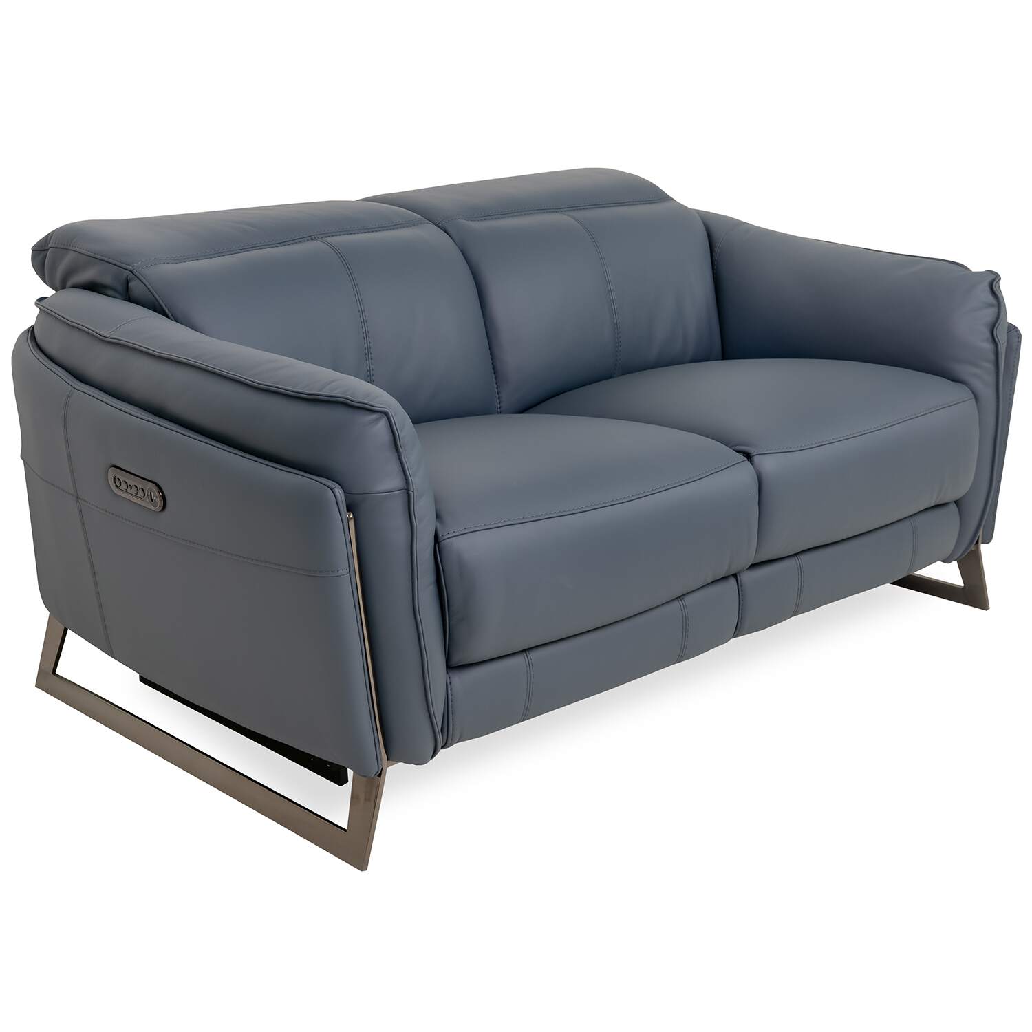 Classic comfort and calming color unite in the Remington Power Loveseat. Upholstered in ocean blue leather, Remington features a welcoming design with soft, buoyant cushioning, layered armrests, and angled legs in black nickel-plated metal. Power motion controls let you customize your relaxation at the touch of a button, while integrated USB ports make it a breeze to charge your devices. Available at a fantastic value, Remington is a loveseat that will instantly feel like home.
