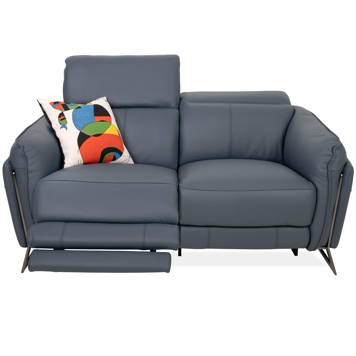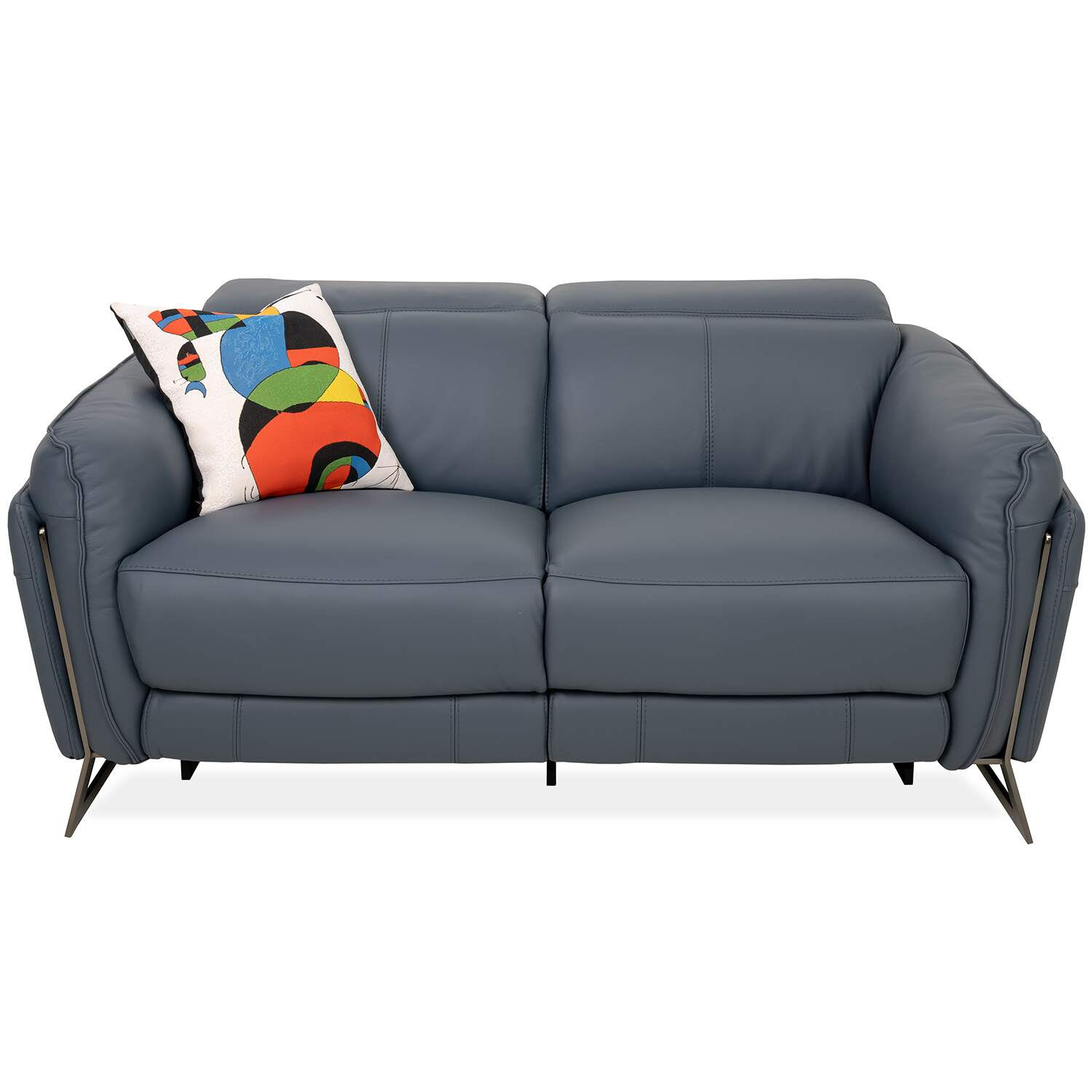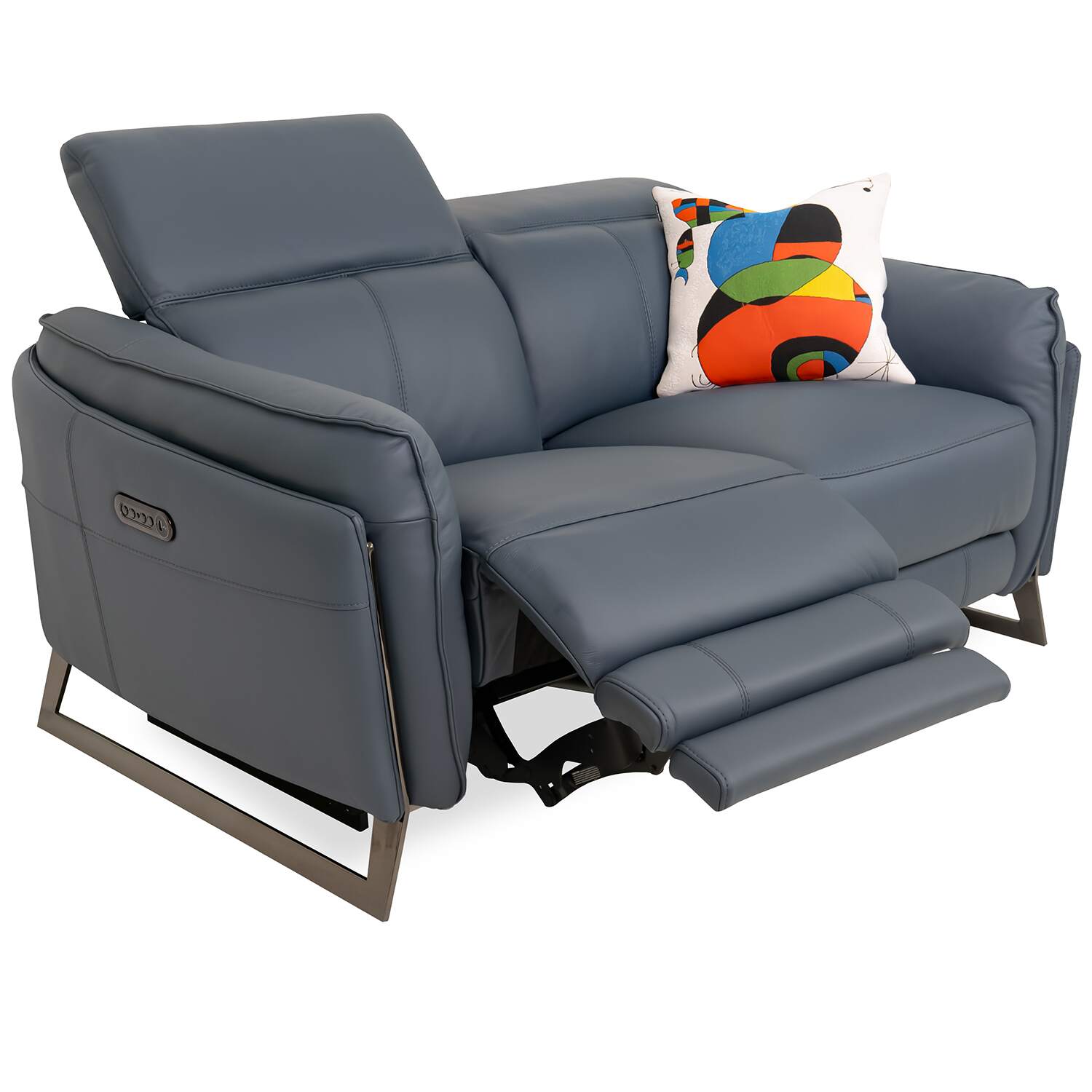 Classic comfort and calming color unite in the Remington Power Loveseat. Upholstered in ocean blue leather, Remington features a welcoming design with soft, buoyant cushioning, layered armrests, and angled legs in black nickel-plated metal. Power motion controls let you customize your relaxation at the touch of a button, while integrated USB ports make it a breeze to charge your devices. Available at a fantastic value, Remington is a loveseat that will instantly feel like home.