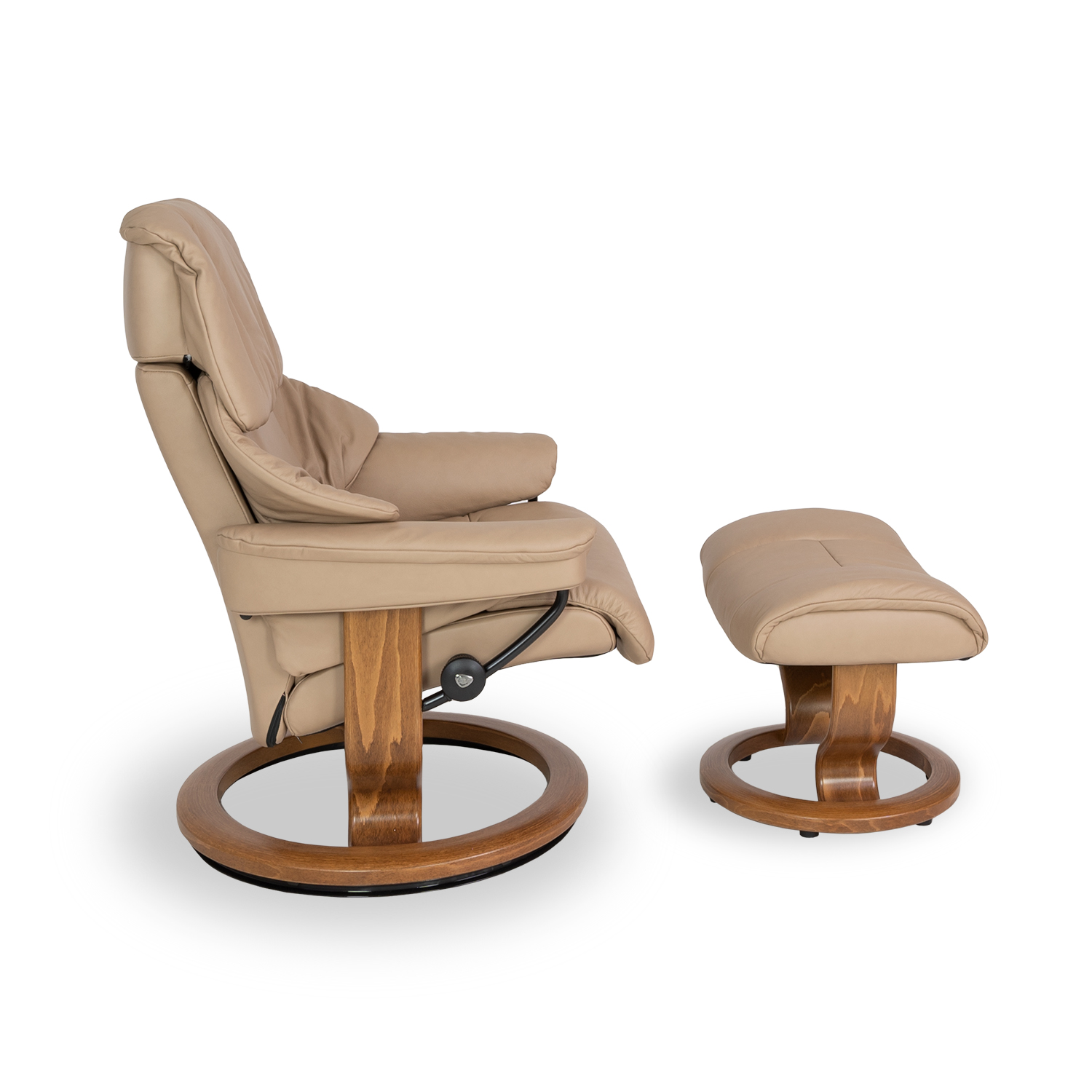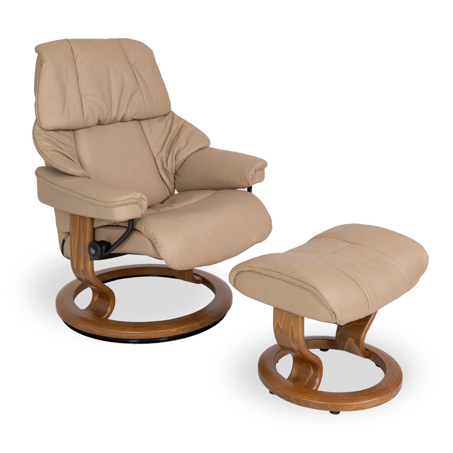 The Reno Medium Chair and Ottoman, available in sand Paloma leather with a classic teak base, is a time-honored piece in the Stressless® collection. Reno's soft padding and height-adjustable headrest make it an enduring symbol of comfort: supportive, well-designed, and durable. This chair features the Stressless® Plus™ and Glide systems, which let it continually cradle your head, neck, and lumbar spine, as well as adjusting to your seating position based on shifts in your body. The Reno now comes with a comfort upgrade featuring improved ergonomic support and more padding in the head, back, and seat to give you better relaxation than ever.