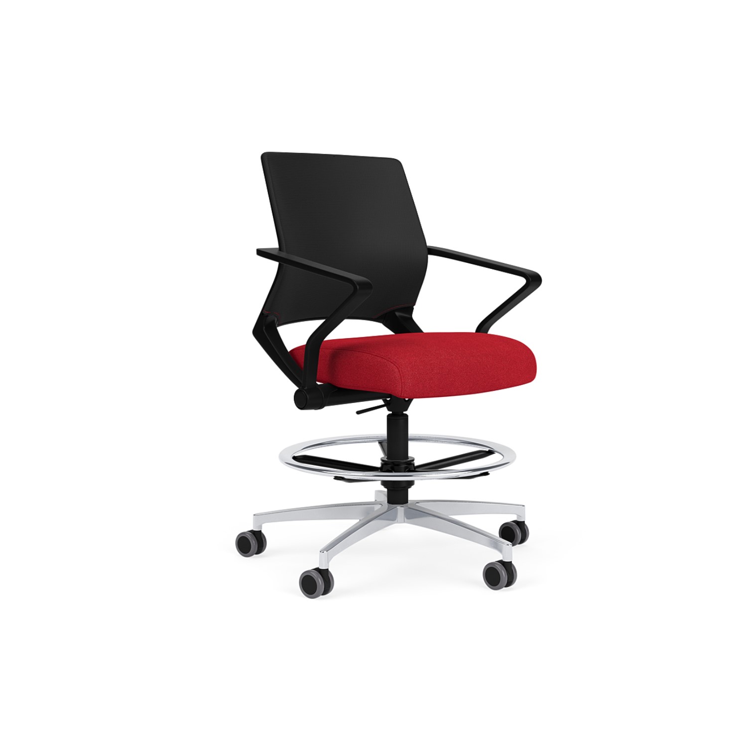 The Reset Light Task Chair is compact, streamlined, and full of ergonomic features to help you get work done. This height-adjustable chair has a classic yet sharp silhouette with its matte black frame and loop arms that gently slope downward. The backrest is outfitted in black high-performance mesh and can flex 22 degrees, letting you find your preferred posture. For added comfort, Reset's red fabric seat is filled with injection-molded, cold-cured foam and sports an ergonomic waterfall edge. The polished aluminum 5-star base adds a clean look, while the grey-black casters with a safety brake let this chair glide smoothly over any floor surface, or stay put when it needs to.