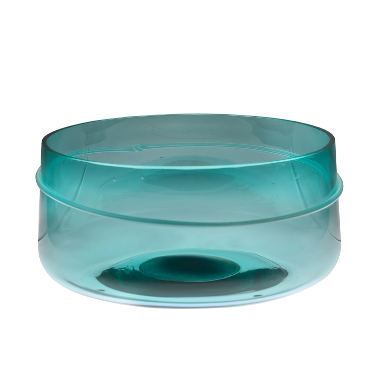 [0] => The Ribbon Wrapped bowl, crafted in turquoise hand-blown glass, features delicate, stunning design. The body of the bowl is shaped in a steel mold, giving it a smooth, precise shape that contrasts beautifully with the blue ribbon of glass that is wrapped - by hand - around its center.