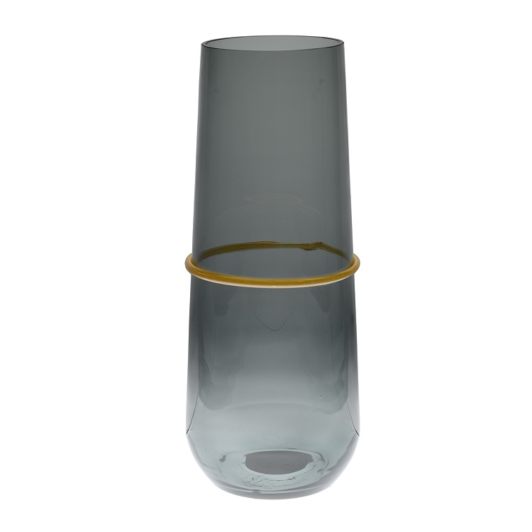 [0] => The Ribbon Wrapped vase, crafted in grey hand-blown glass, features delicate, stunning design. The body of the vase is shaped in a steel mold, giving it a smooth, precise shape that contrasts beautifully with the gold ribbon of glass that is wrapped - by hand - around the center of the vase.
