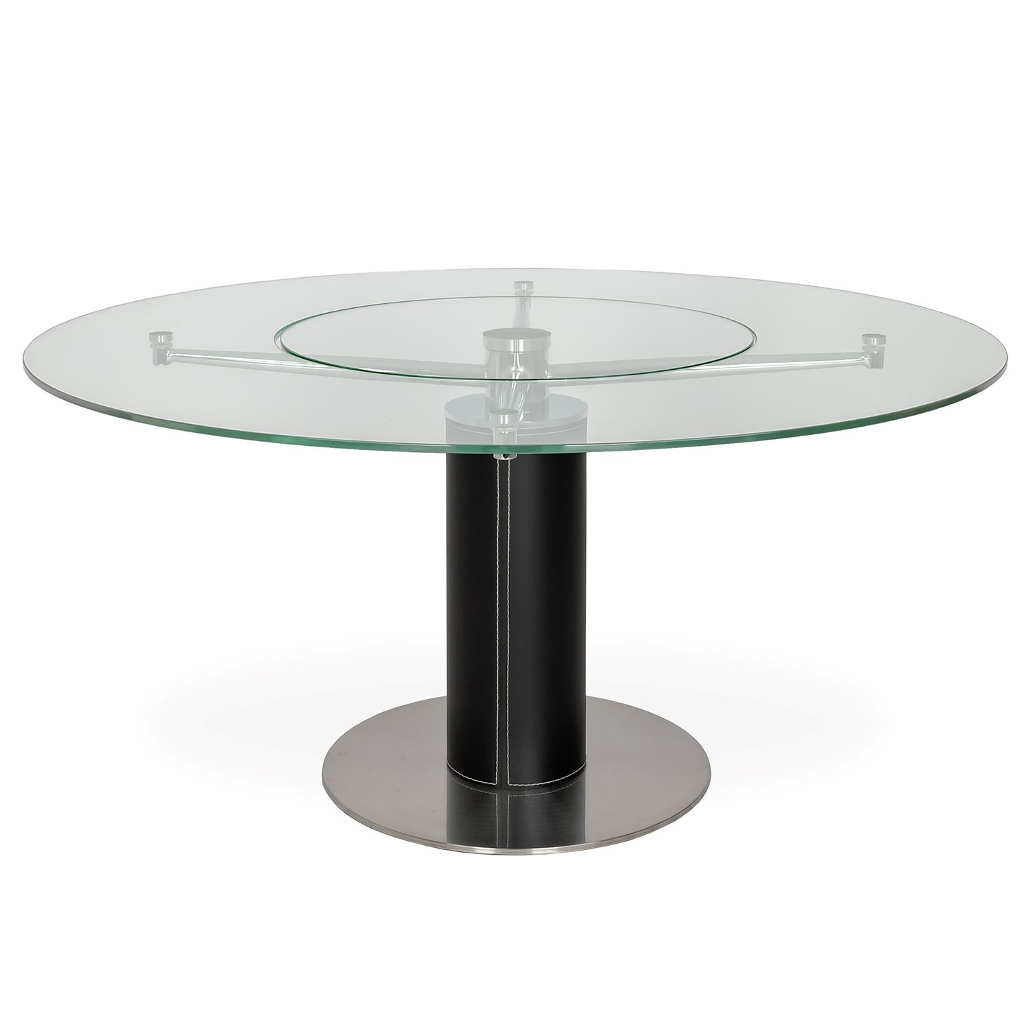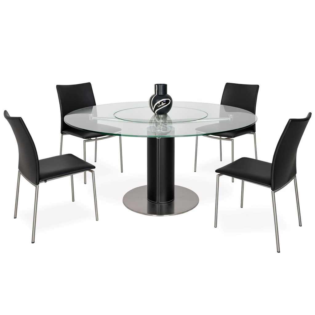 [0] => rimini dining table 60" dia glass top w/lazy susan, black bonded leather/ivory stitch, brushed stainless steel base - design by mario morbidelli