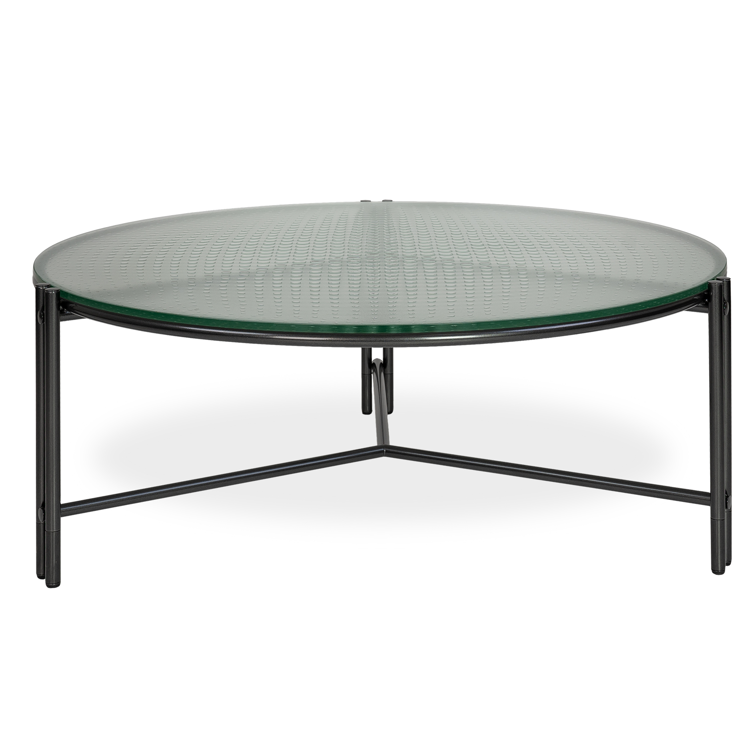 [0] => Designed by Elite Modern, the Ripley Cocktail Table presents a quintessentially contemporary fusion of texture and shape. This table's unique fused glass top has an underside wrought in a pattern of squares that gradually diminish in size as they approach the tabletop's edge, creating a three-dimensional effect. Coated with a pewter finish, the slim, angular frame and three sets of double legs form crisp lines that contrast with the rounded qualities of the tabletop.