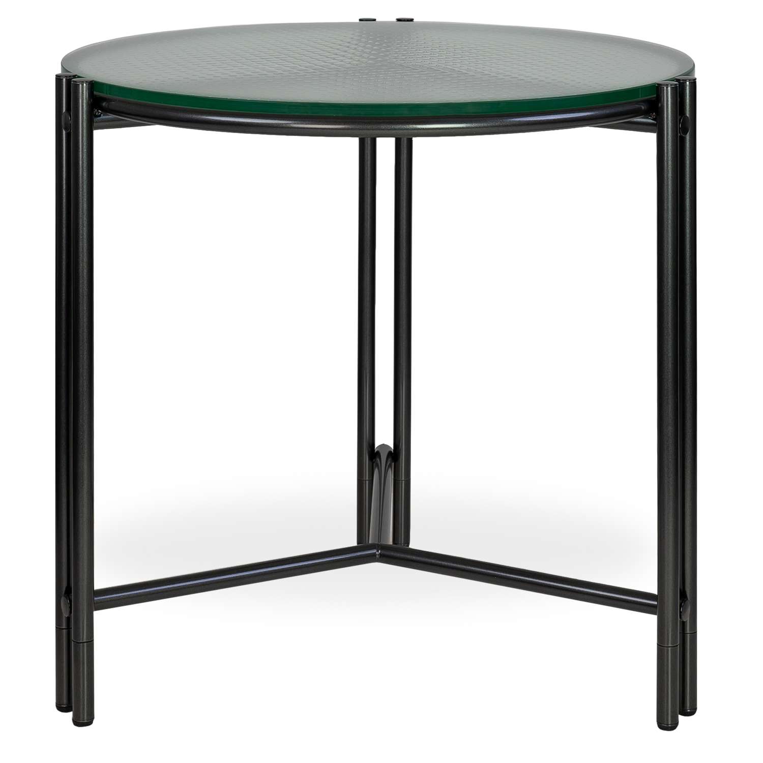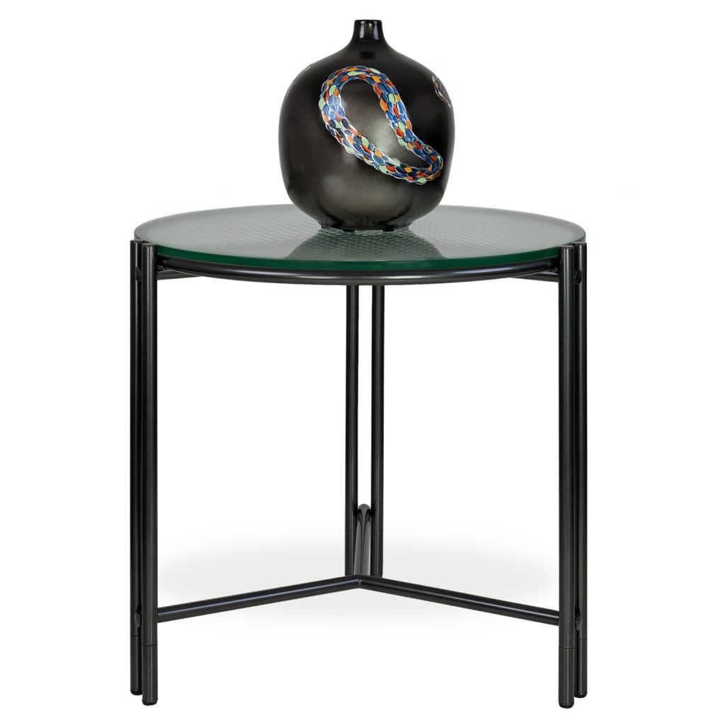[0] => Designed by Elite Modern, the Ripley End Table presents a quintessentially contemporary fusion of texture and shape. This table's unique fused glass top has an underside wrought in a pattern of squares that gradually diminish in size as they approach the tabletop's edge, creating a three-dimensional effect. Coated with a pewter finish, the slim, angular frame and three sets of double legs form crisp lines that contrast with the rounded qualities of the tabletop.