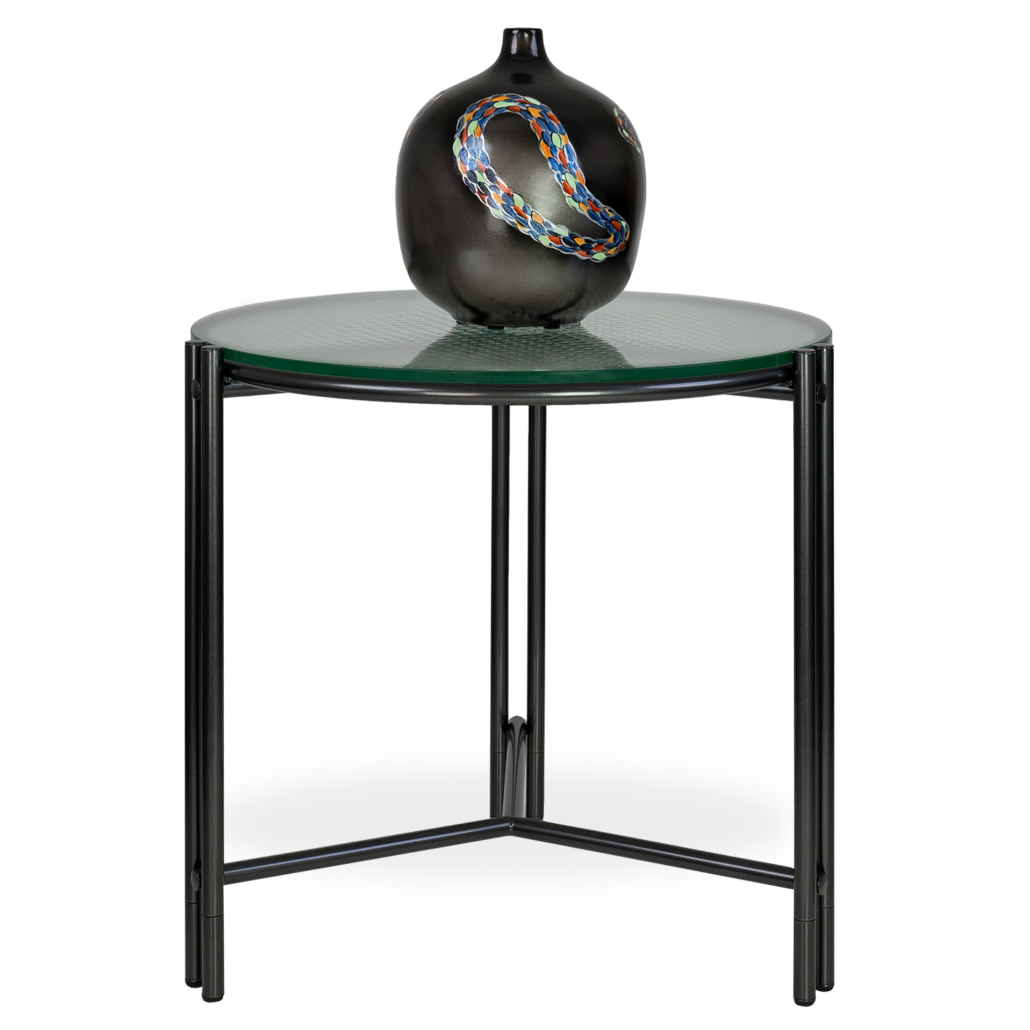 Designed by Elite Modern, the Ripley End Table presents a quintessentially contemporary fusion of texture and shape. This table's unique fused glass top has an underside wrought in a pattern of squares that gradually diminish in size as they approach the tabletop's edge, creating a three-dimensional effect. Coated with a pewter finish, the slim, angular frame and three sets of double legs form crisp lines that contrast with the rounded qualities of the tabletop.