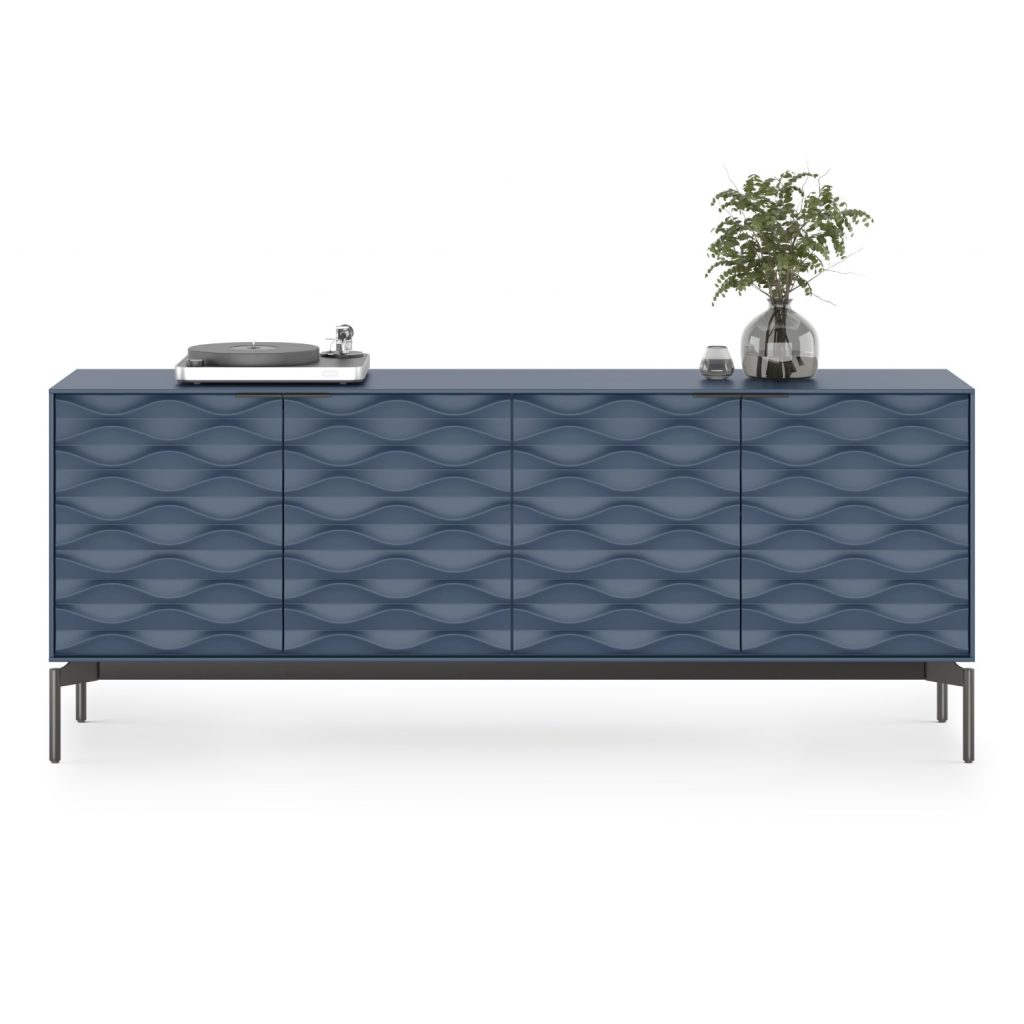 [0] => Designed by Jason Guidry for BDI, the Ripple Storage Console merges seamless functionality with beautifully fluid patterning. Ripple features an ocean blue finish with brushed carbon legs and three soft-close doors carved with a sinuous design that evokes waves in water. Both elegant and versatile, this storage console comes with two clear tempered-glass shelves and two utility drawers -- all with adjustable positioning -- as well as floor levelers and wire management slots for maximal adaptability. Ripple's drawers have soft, nonslip liners that can be removed for cleaning, allowing for worry-free storage of even fragile items. A marvel of form and function, Ripple can be used in your living room or entryway as a credenza, or in your dining room as a sideboard or bar.