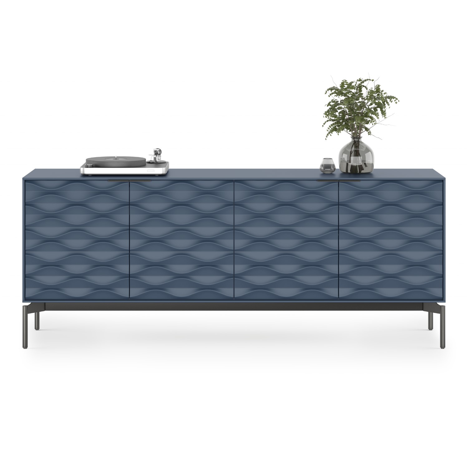 Designed by Jason Guidry for BDI, the Ripple Storage Console merges seamless functionality with beautifully fluid patterning. Ripple features an ocean blue finish with brushed carbon legs and three soft-close doors carved with a sinuous design that evokes waves in water. Both elegant and versatile, this storage console comes with two clear tempered-glass shelves and two utility drawers -- all with adjustable positioning -- as well as floor levelers and wire management slots for maximal adaptability. Ripple's drawers have soft, nonslip liners that can be removed for cleaning, allowing for worry-free storage of even fragile items. A marvel of form and function, Ripple can be used in your living room or entryway as a credenza, or in your dining room as a sideboard or bar.