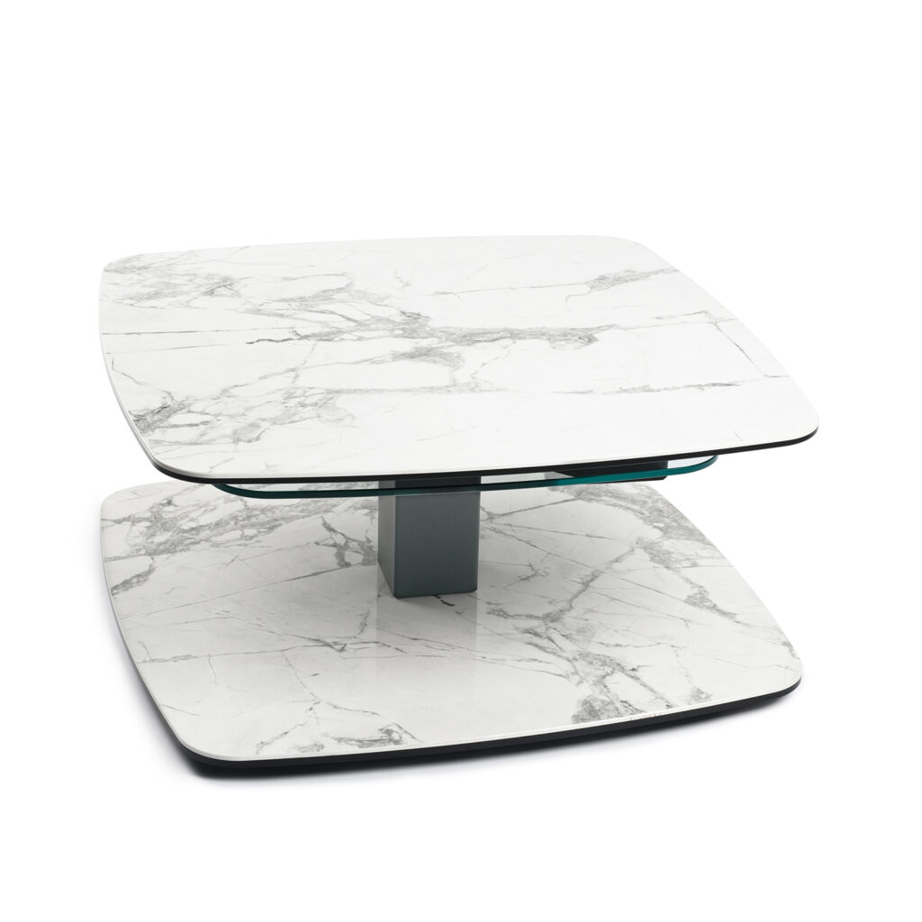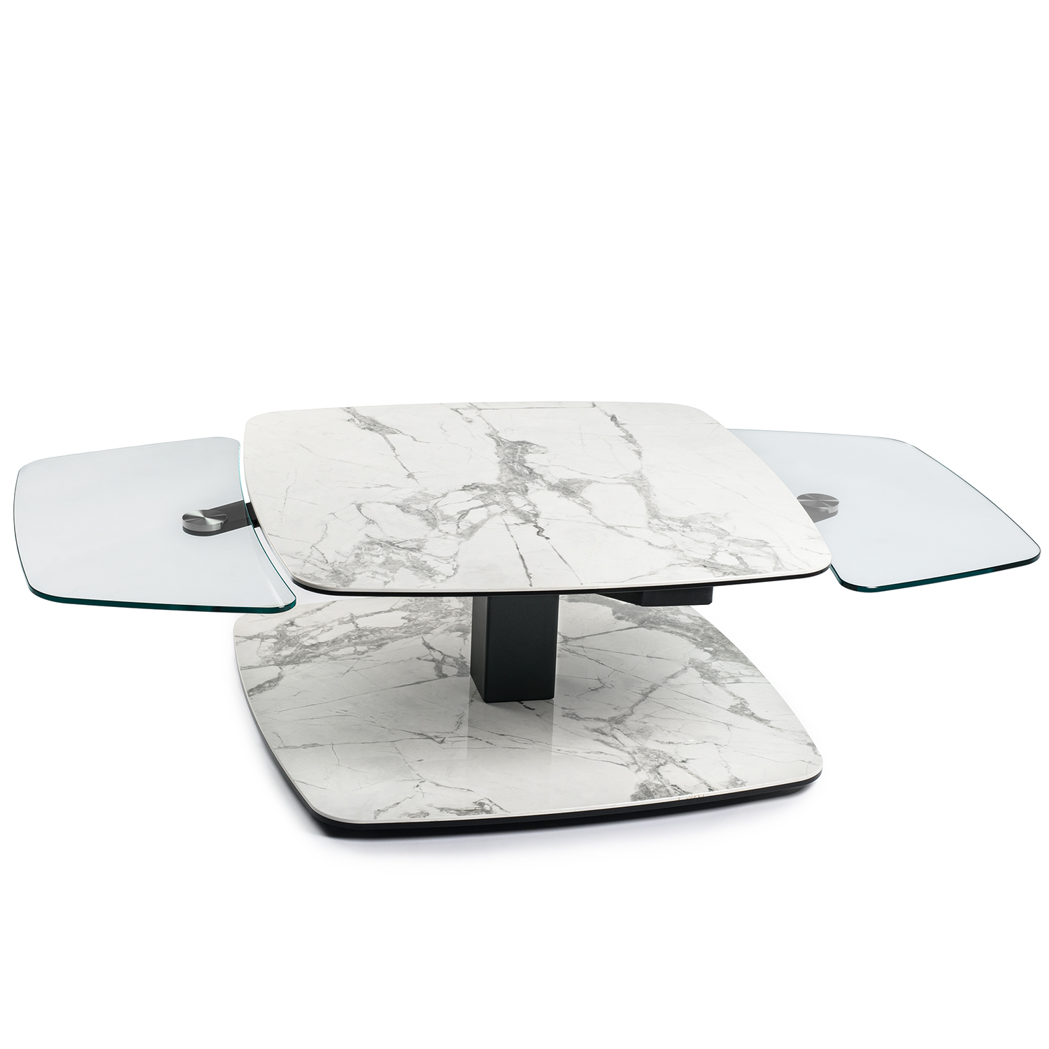 The Riviera Cocktail Table features an innovative mechanism that opens the small tabletops automatically when you rotate the upper top; an effortless design that is versatile to your needs. The white ceramic marble top complements the smaller glass ones, creating a soft, monochromatic look. The rounded edges of this piece strikingly contrast with sharp angles of the anthracite center column.