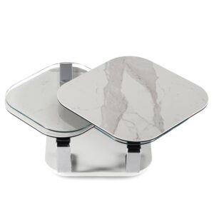 [0] => The Riviera Cocktail Table features an innovative mechanism that opens the small tabletops automatically when you rotate the upper top; an effortless design that is versatile to your needs. The white ceramic marble top complements the smaller glass ones, creating a soft, monochromatic look. The rounded edges of this piece strikingly contrast with sharp angles of the anthracite center column.