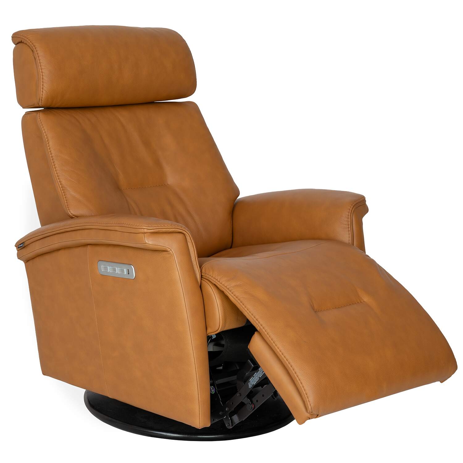 [0] => The Rome Large Power Motion Recliner, available in warm Vintage Cognac Astro leather with matching stitching, features a 270-degree swivel base and a sophisticated three-motor system that controls reclining and footrest functions, lumbar support, and headrest support. This ergonomic system is able to correctly support your lower back and neck so you can rest easy, and the headrest height is manually adjustable. The control panel also contains a USB port, so you can easily charge your electronic devices while you relax.