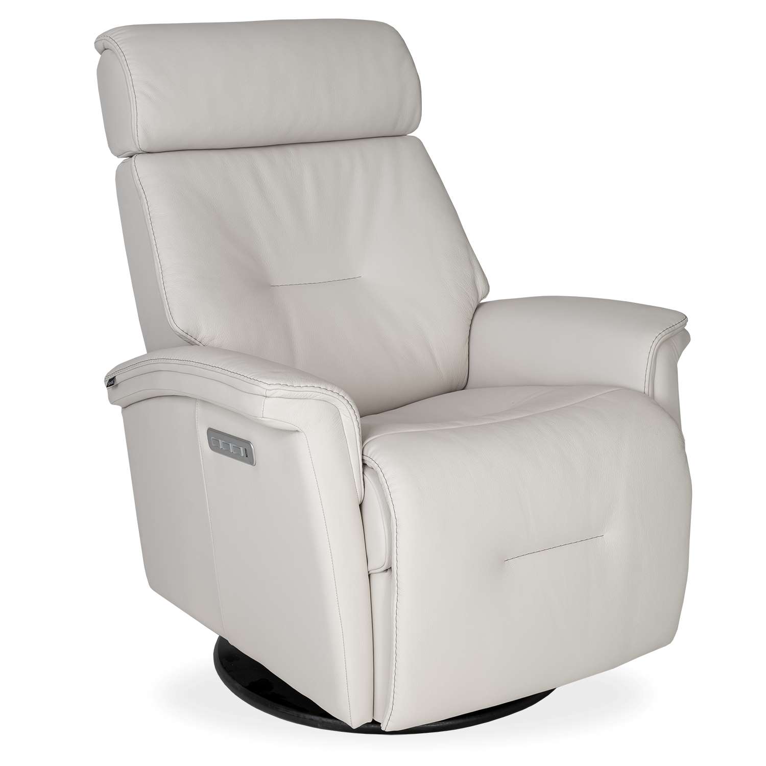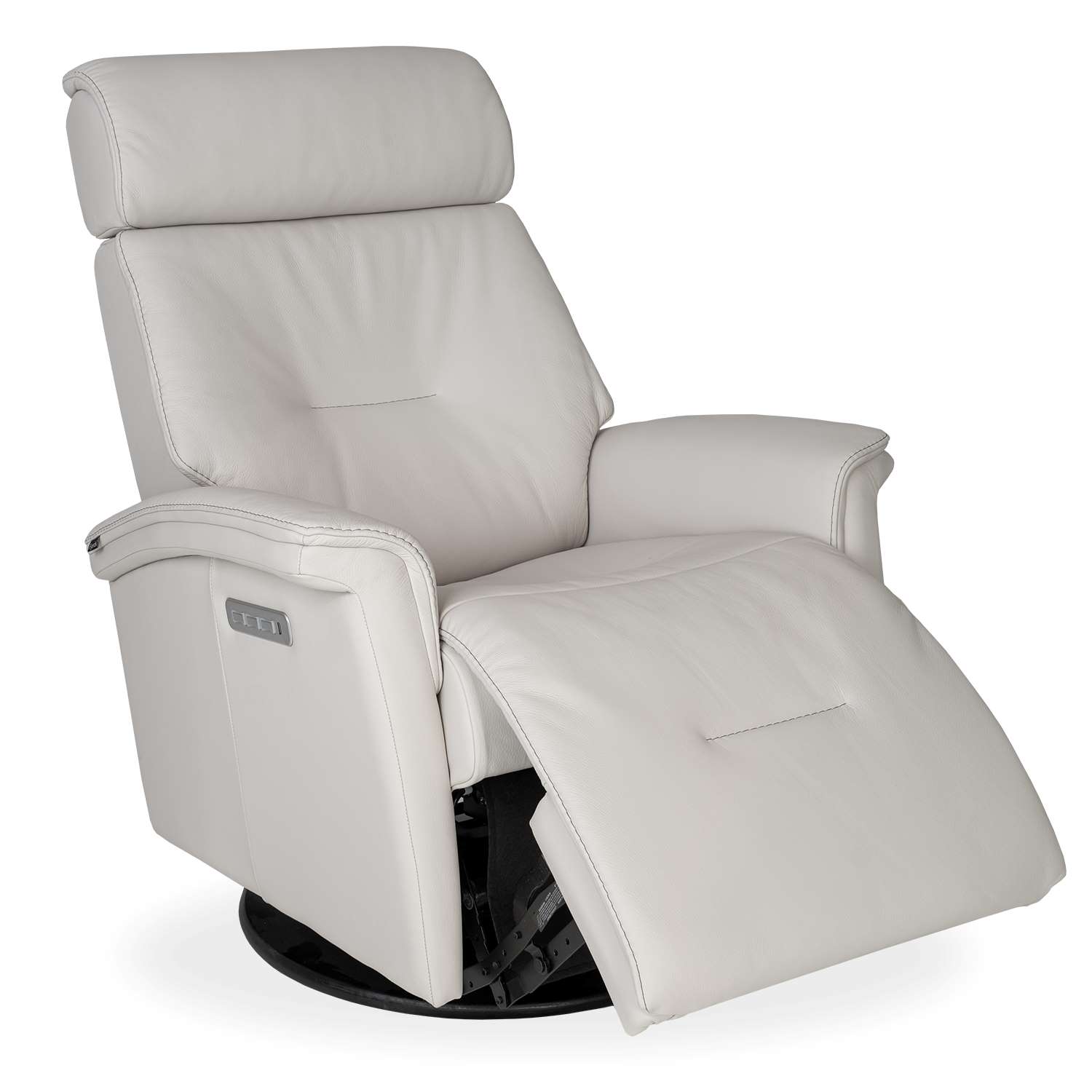 [0] => The Rome Large Power Motion Recliner, available in ivory Astro leather with matching stitching, features a 270-degree swivel base and a sophisticated three-motor system that controls reclining and footrest functions, lumbar support, and headrest support. This ergonomic system is able to correctly support your lower back and neck so you can rest easy, and the headrest height is manually adjustable. The control panel also contains a USB port, so you can easily charge your electronic devices while you relax.