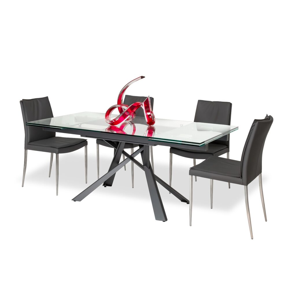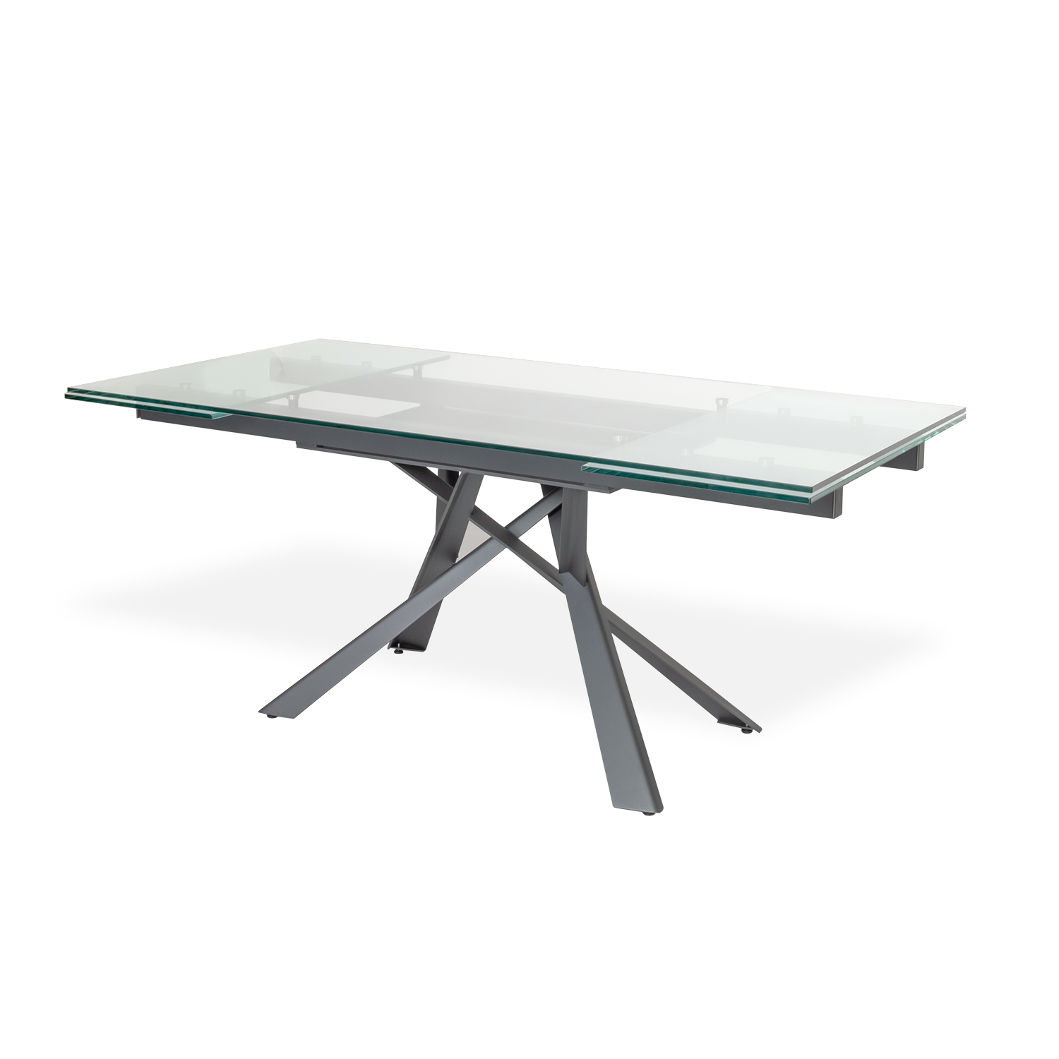 [0] => Dine in sophistication with the Romeo Condo Sized Dining Table by Ozzio, featuring an extendable glass tabletop and bold sculptural base. The clear glass top has two extendable leaves stored underneath that can be pulled out and upward to seat up to 10 diners. The base consists of intersecting metal beams in graphite coloring with a matte finish. Bring contemporary style with a touch of the industrial to your dining space with Romeo.