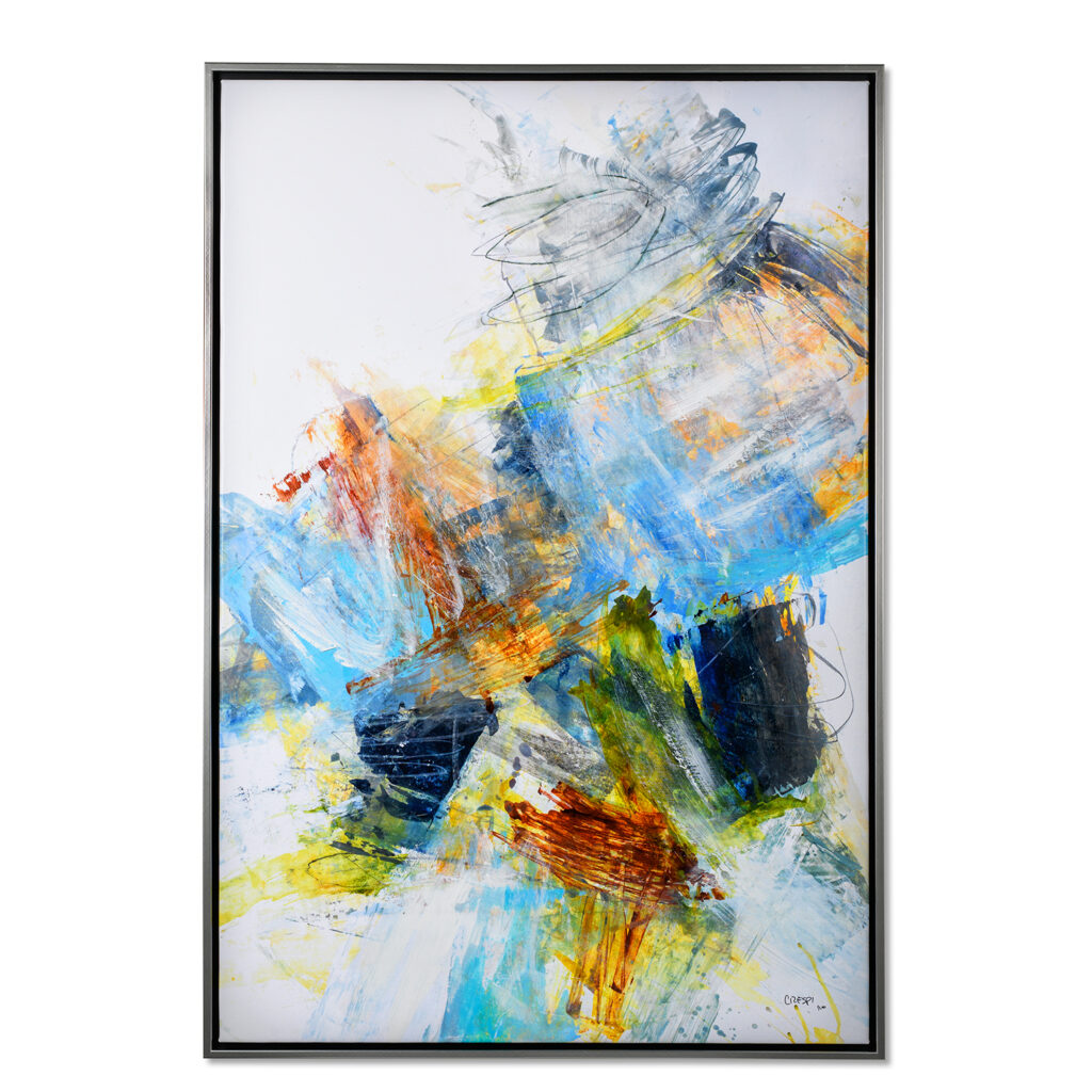 The Rotations II Wall Art uses a rainbow of color to create a sense of movement. Bright blues, oranges, and yellows mix together to form more colors, adding texture and giving shape to this rotating, dynamic piece. Bold and attractive, this wall art will bring warmth and movement into your living or office space. Artwork on paper by E. Cavallo with a silver shadowbox frame.