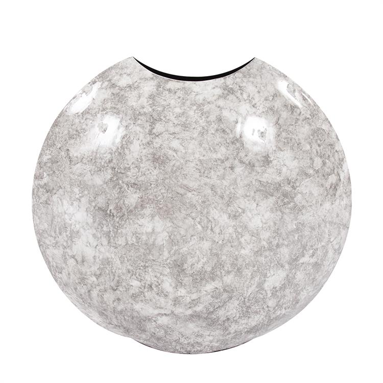 The Round Marbled vase features a disc shape with a sharply curved mouth. The vase has a grey and white marbled surface and streamlined look.