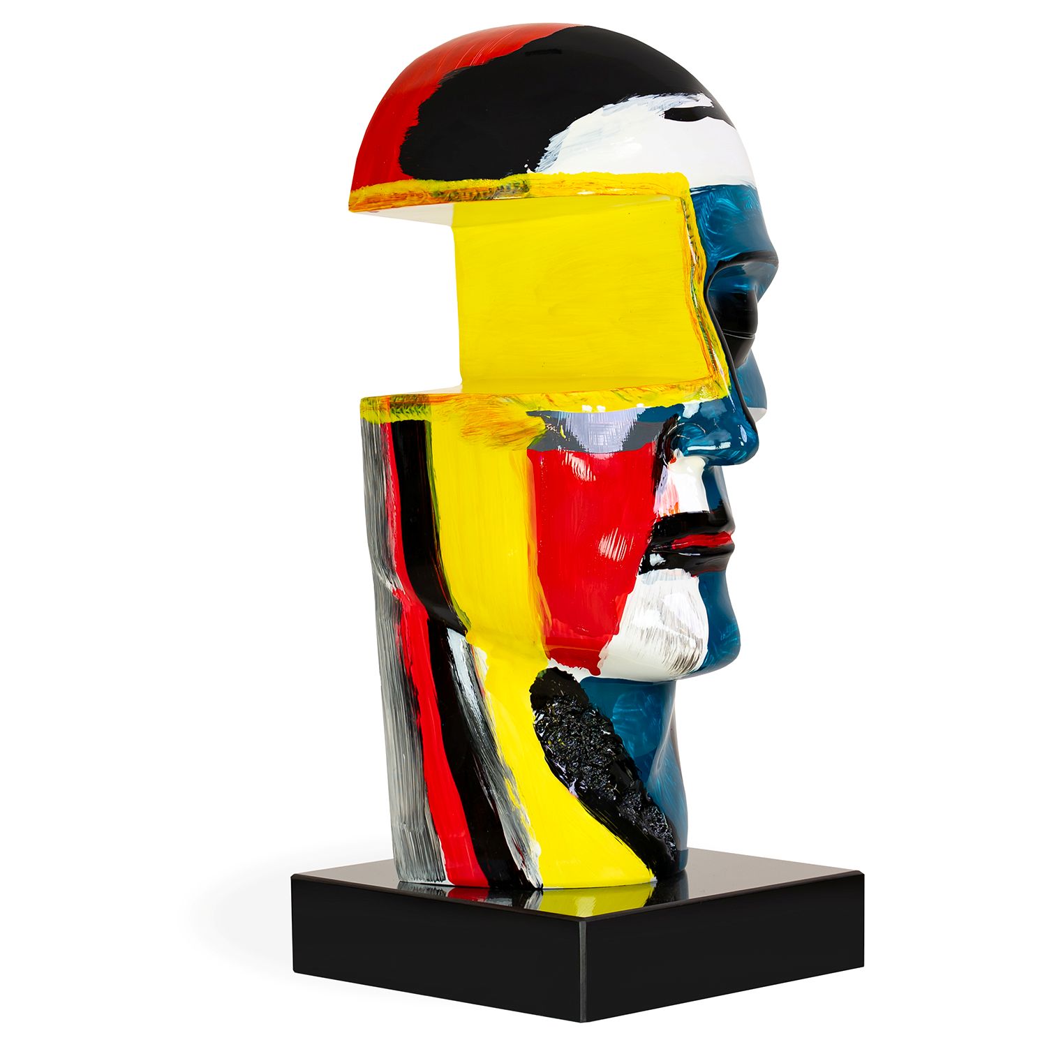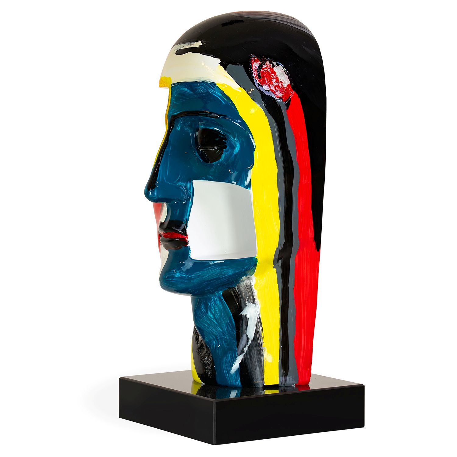 Made by Ambienti Glamour of Italy, the Roy Sculpture is a semi-abstract rendition of a human head splashed with bold tones of turquoise, red, yellow, grey, and black. Geometric cutouts and irregular abraded sections in the figure's head utilize negative space to create a bold and edgy look. Available with a glossy finish, the Roy Sculpture stands on a black stone base for ease of display.