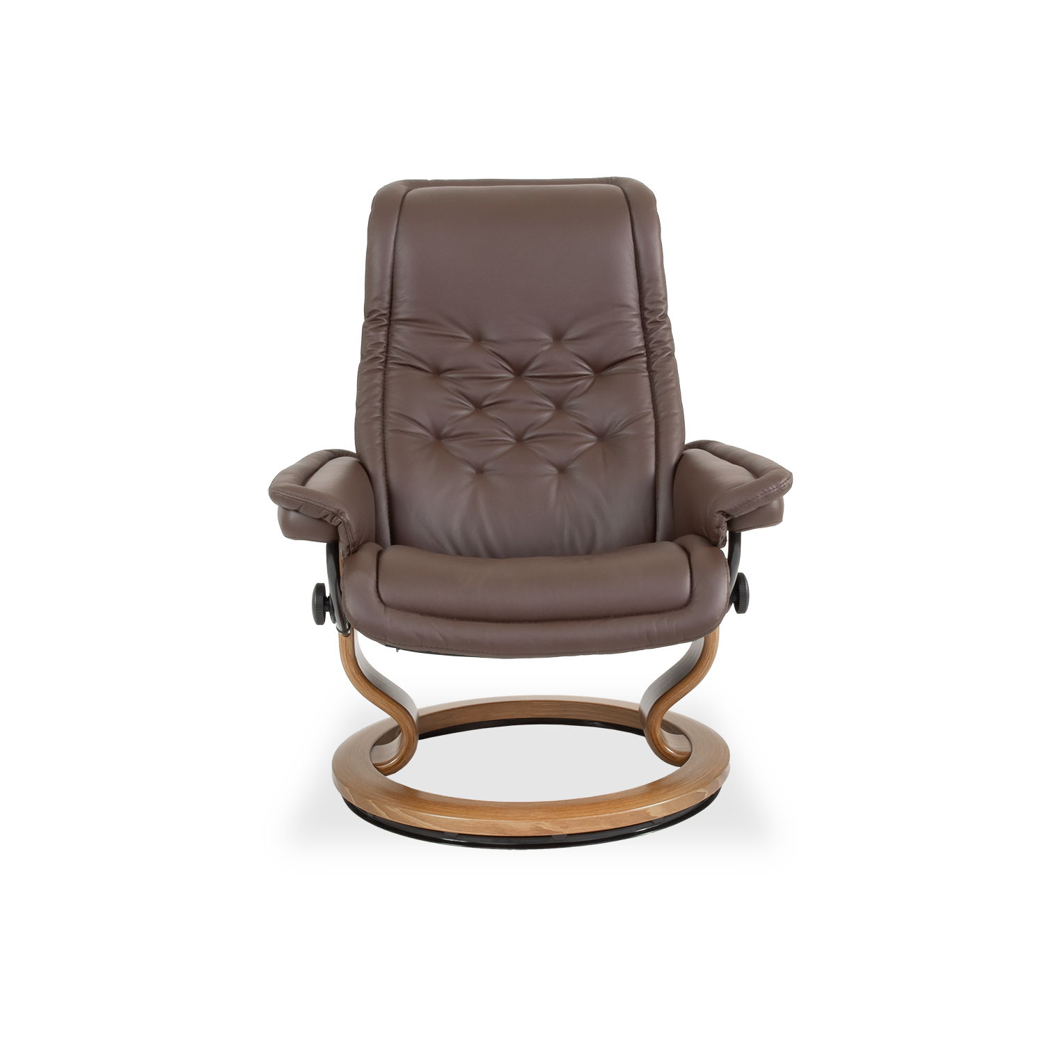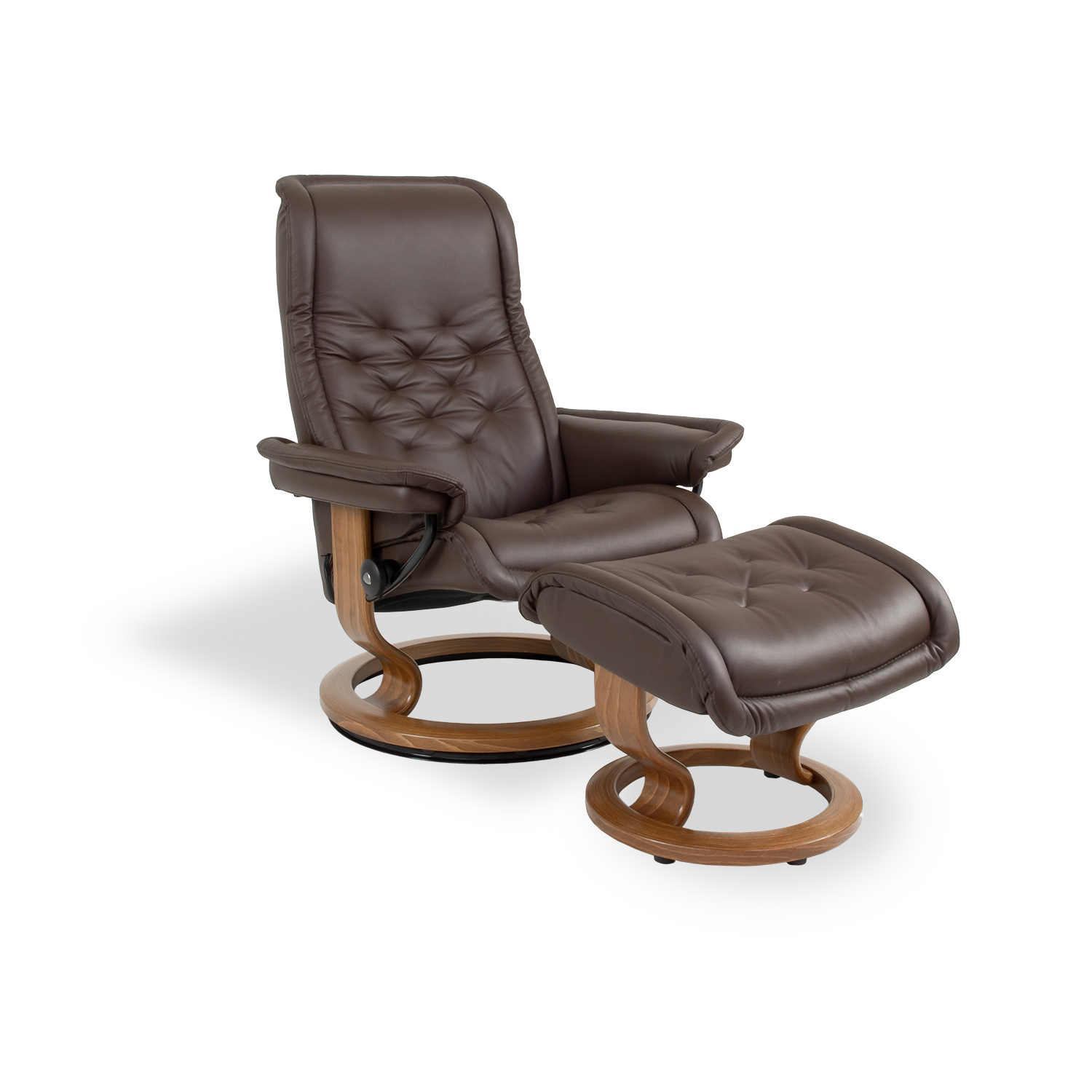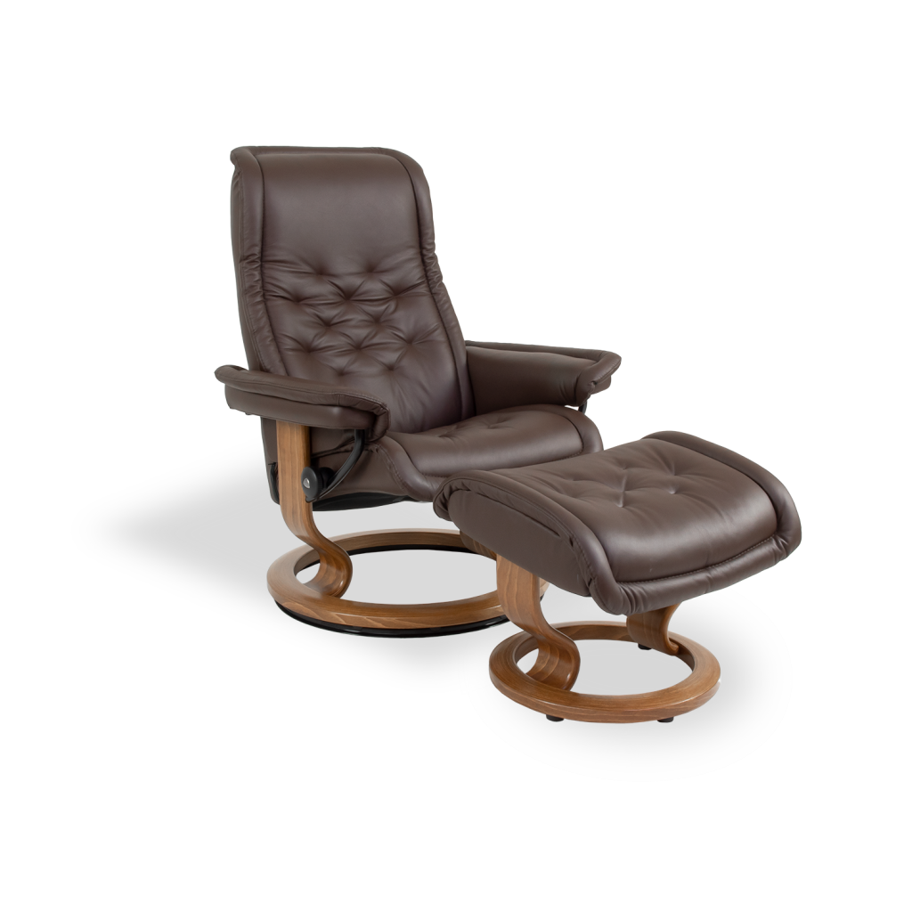 The Royal Medium Chair and Ottoman, designed by Ekornes of Norway, is one of the original Stressless® designs, dating back to 1981. Re-introduced to celebrate 50 years of Stressless®, Royal has been updated to enhance its retro look and features cutting edge Stressless® comfort technology, including the patented Plus™ and Glide systems, which allow the chair to provide continuous support for the head and lower back, while also adjusting the reclining angle based on shifts of the body. Royal's tufted back and smooth stitched edges give this chair a sophisticated look and a comfortable feel, so you can sit back and stress less.