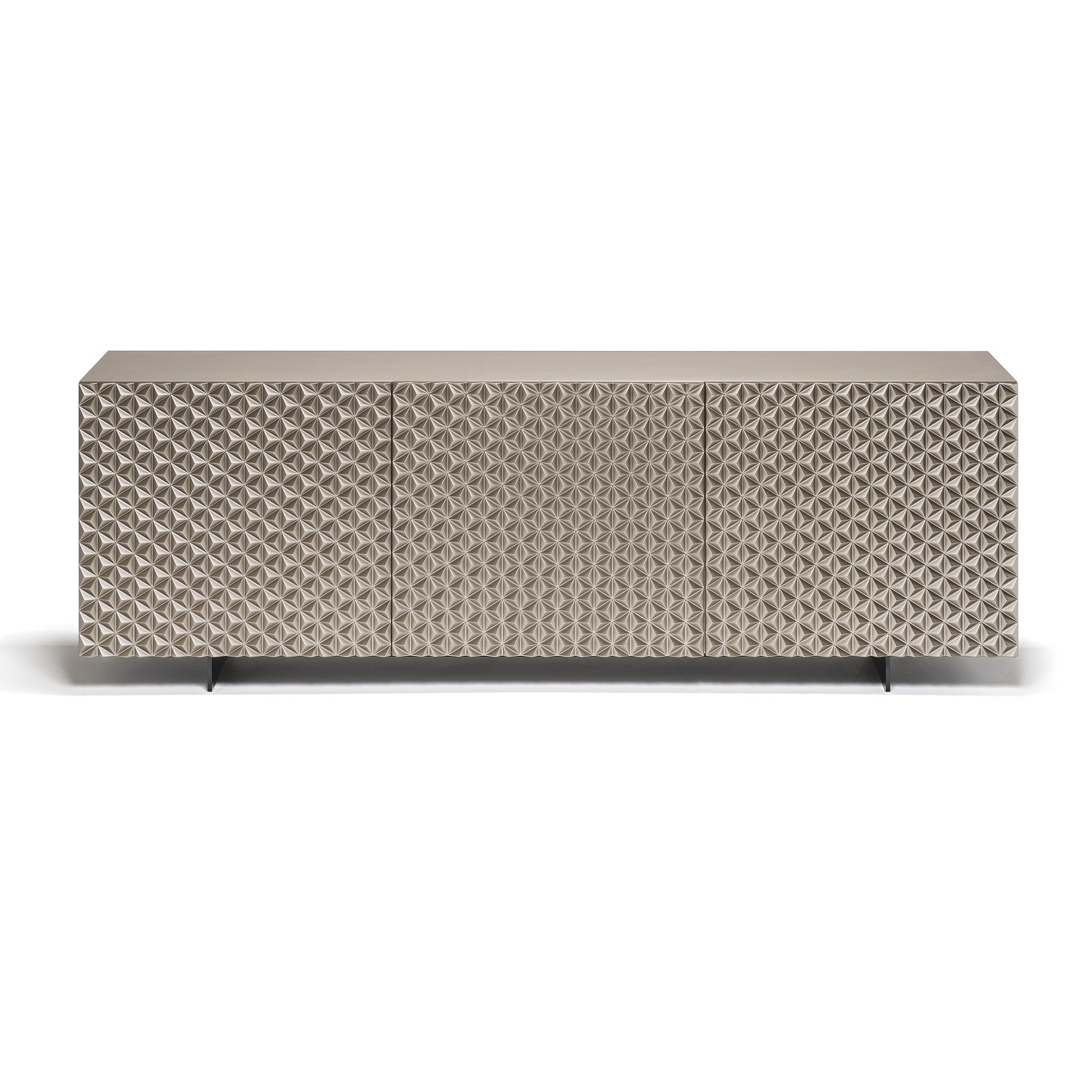 [0] => The Royalton Sideboard, made in Italy, features regal and ornate styling with an eye-catching, art-deco inspired door design. The textured pyramid pattern, crafted from titanium lacquered wood with a polyurethane finish, draws the gaze in and creates a bold impact. With clear glass shelves and a mounted internal drawer, this sideboard has plenty of storage space, ensuring it is both beautiful and functional.