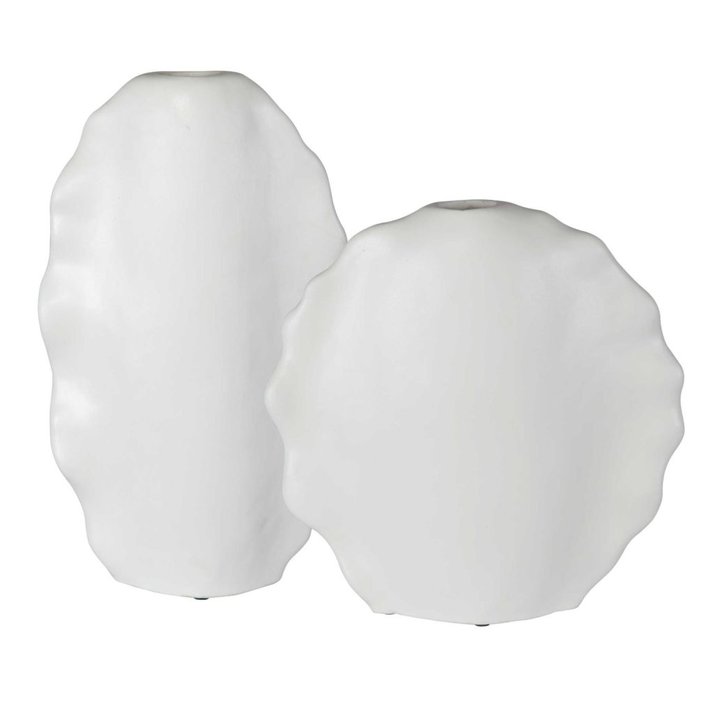 [0] => Made of ceramic with a matte white glaze, the Ruffled Feather Vases have graceful, curved edges that evoke feathers, fallen leaves, or other organic forms. Versatile and beautiful, this pair consisting of a wider vase and narrower vase can stand separately or together to add a soft touch to any interior.