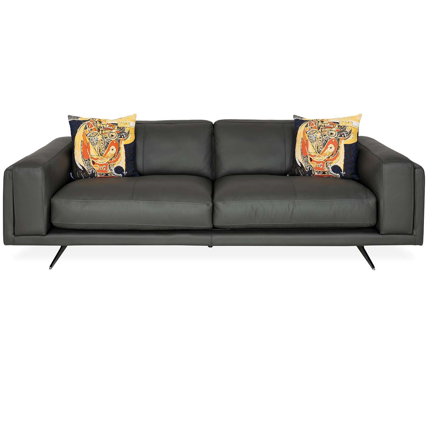 Inspired by mid-century modern design, the Rupert Sofa features dark grey leather upholstery and a plush silhouette with two wide seats. Double-track armrests with a nested look add extra comfort and stability, while the feather blend cushions are supported by no-sag springs for lasting luxury. Vertical accent stitching and nickel-plated "ski" legs round out this spacious, contemporary sofa that will become your new favorite place to relax.