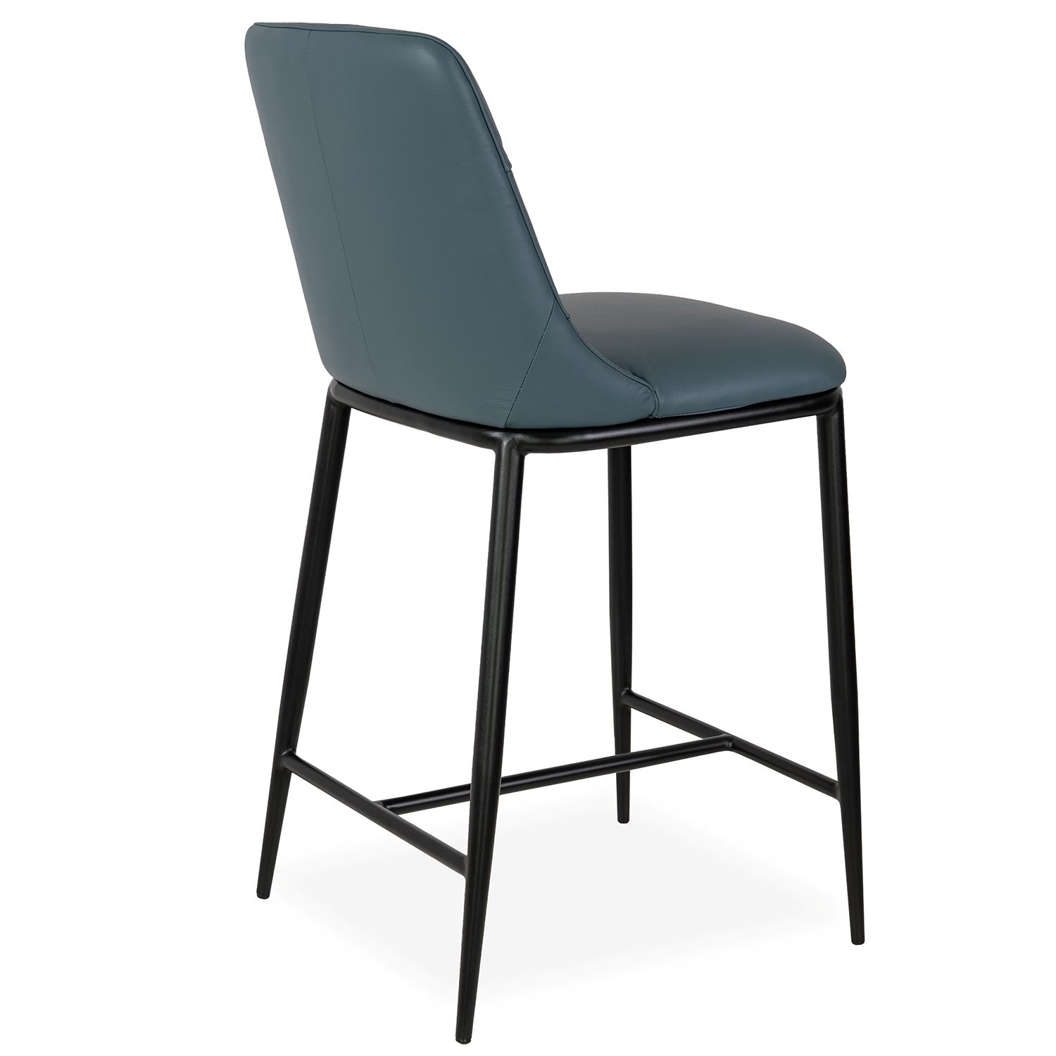 The Ryder Counter Stool features stylish blue leather upholstery, slim black metal legs, and a rounded backrest that curves gently down to the sides of the seat. Ryder's backrest is adorned with accent stitching and has a pillowy feel that facilitates relaxation and conversation at your counter, kitchen island, or home bar. Part of Copenhagen's Essentials Collection, Ryder's versatile style and superior comfort will enhance any dining setup.